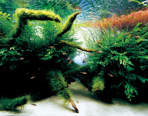 Podłoże w Akwarium Naturalnym: to porcja żwiru, na której sadzi się rośliny akwariowe. Jest ono swoistą kombinacją różnych substancji. Spód podłoża to 5-10 mm warstwa Power Sandu, który zawiera substancje organiczne pochodzenia roślinnego oraz wolno uwalniające się nieorganiczne substancje odżywcze. Doprowadzają one składniki odżywcze do roślin. Następnie jest warstwa naturalnej gleby Amazonia. Jej cząsteczki są delikatne, a wysoka zawartość kwasów organicznych, przyczynia się do rozwoju korzeni. Ostatnia warstwa to jasny piasek, używany jako piasek dekoracyjny na pierwszym planie kompozycji. Uzasadnieniem dla zastosowania tak zróżnicowanych materiałów jest fakt, że taki system pozwala na zdrowy rozwój roślinności i naturalny wygląd akwarium. Pomimo, że jasny piasek nie przyczynia się do rozwoju roślin, tak jak warstwa Aqua Soil, używa się go w celach dekoracyjnych. Nie należy jednak dopuszczać do rozrastania się roślin na tym obszarze gdyż nie ma tam warunków dla ich wzrostu.
