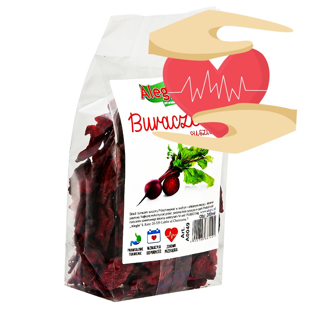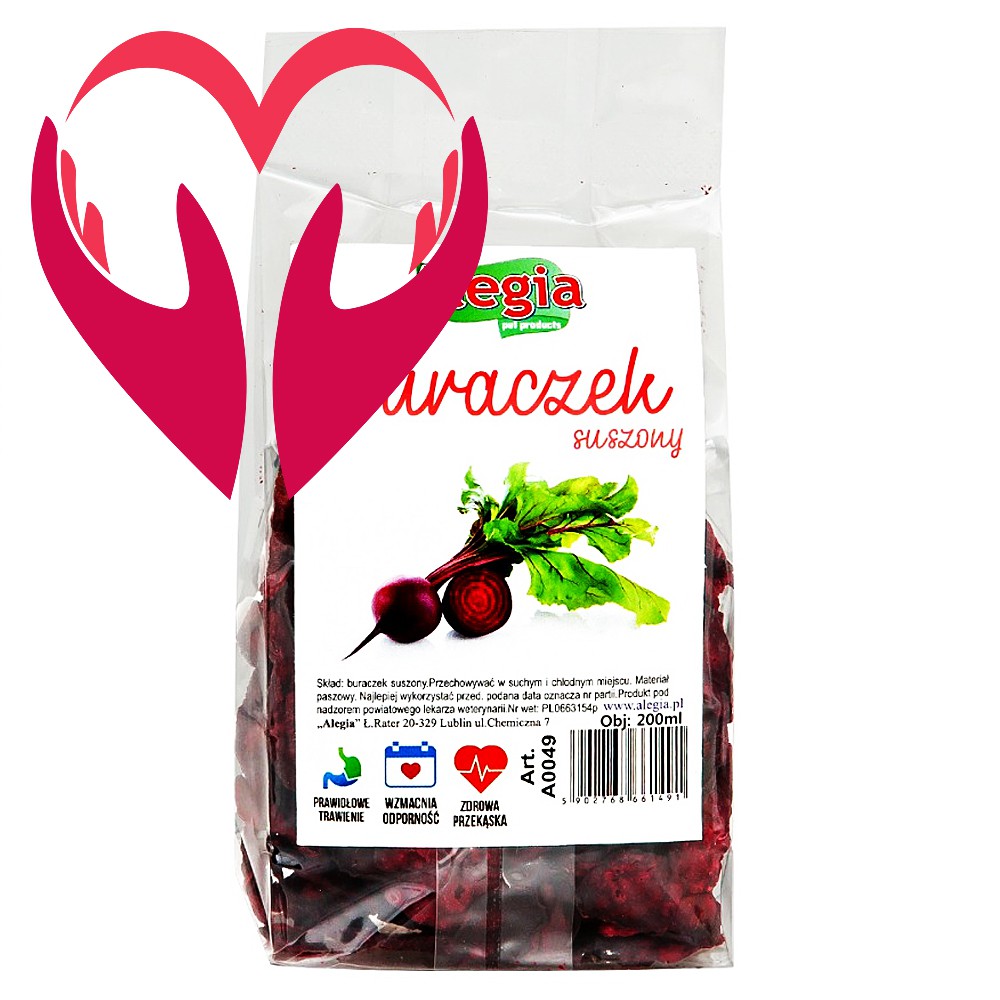 Alegia Burak Chips to doskonałe urozmaicenie diety gryzoni i królików, która dostarcza niezbędnych składników mineralnych i witamin. To w 100% naturalny, zdrowy przysmak bogaty w witaminy z grupy B oraz witaminę C. Zawiera także wapń, żelazo oraz błonnik. Polecany jako dodatek w codziennym żywieniu gryzoni i królików, duża zawartość błonnika bardzo korzystnie wpływa na jelita, buraczek przeciwdziała również zaparciom oraz posiada właściwości przeciwnowotworowe.