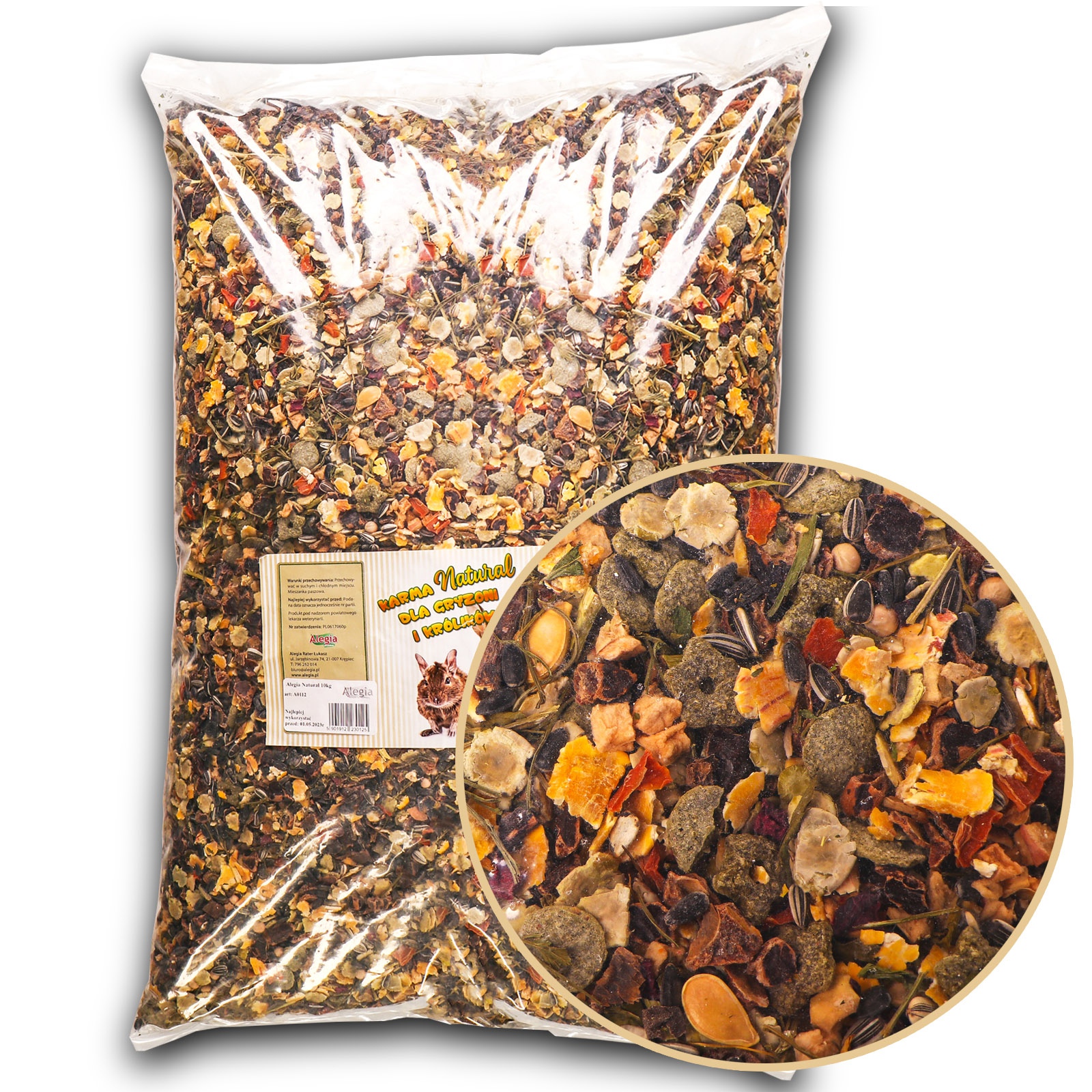 Duża porcja pokarmu dla wszystkich gryzoni oraz królików, jest to pełnoporcjowa mieszanka z najlepszymi składnikami. Zawiera najlepszej jakości warzywa suszone, owoce, nasiona oleiste oraz granulaty. Duża różnorodność składników w pokarmie Natural podnosi smakowitość karmy i sprawia, że jest chętnie zjadana praktycznie w całości przez wszystkie króliczki oraz gryzonie. W swoim składzie karma zawiera również suszone warzywa np.: ziemniak, burak, bobik czy groch gnieciony, dzięki czemu jest bardzo chętnie pobierana przez wybredne króliki czy gryzonie. Korzystnie wpływa także na kondycję i wygląd okrywy włosowej. Pokarm jest także bogatym źródłem witamin C, A, K oraz wapnia, żelaza, cynku i potasu.