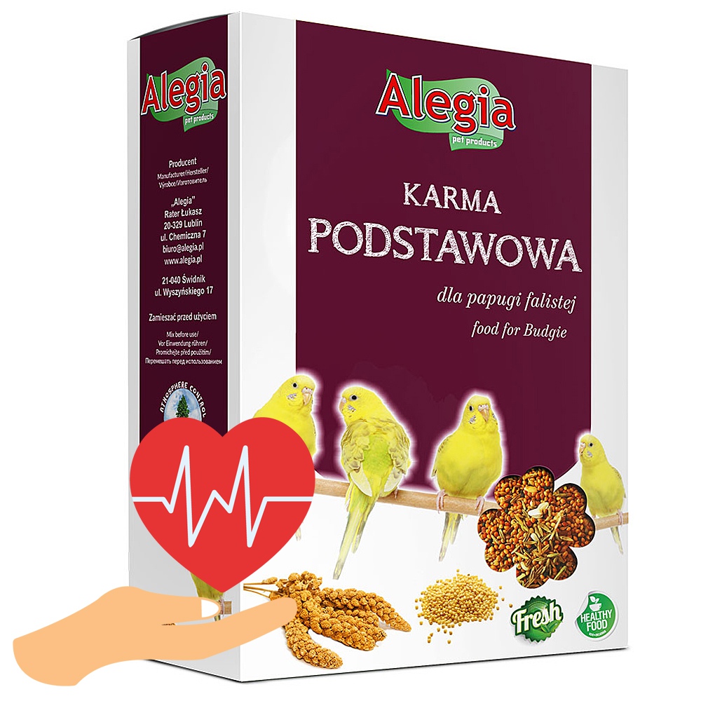 Karma Alegia podstawowa dla papużek falistych jest pełno porcjową mieszanką o zróżnicowanym składzie. Ponadto składniki wchodzące w jej skład są najwyższej jakości, dodatkowo odpylone. Dodatek siemienia lnianego zadba o prawidłowe trawienie oraz łagodzi dolegliwości układu pokarmowego i oddechowego, ponadto oczyszcza organizm z toksyn. Wpływa pozytywnie na upierzenie papużek, natomiast dodatek kanara w pokarmie dostarcza papugom białka, tłuszczu oraz niezbędnych składników mineralnych.