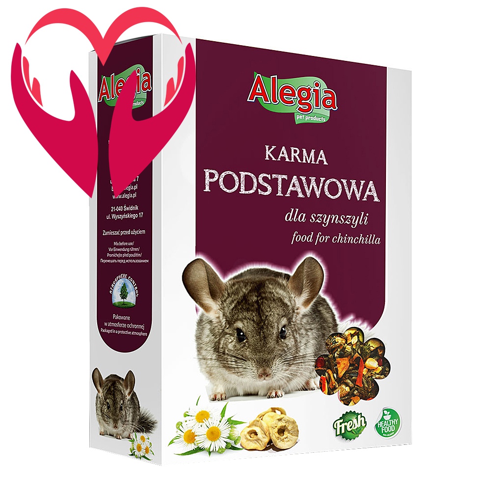 Pokarm Szynszyla Alegia podstawowa dla Szynszyli jest pełno porcjową mieszanką o zmniejszonej zawartości ziaren zbóż, ich miejsce zastąpiliśmy najlepszej jakości suszem z zielonek oraz granulatem z siana. Przede wszystkim mieszanka ta jest doskonałą, zbilansowaną karmą do codziennego żywienia Szynszyli. Ponadto pokarm wzbogacono w wysokiej jakości suszoną lucernę, która jest źródłem białka, oraz błonnika potrzebnych do prawidłowego rozwoju i wzrostu. Karma zawiera suszone warzywa, owoce oraz zioła takie jak rumianek, który wpływa pozytywnie na trawienie, wzmacnia oraz podnosi odporność organizmu.