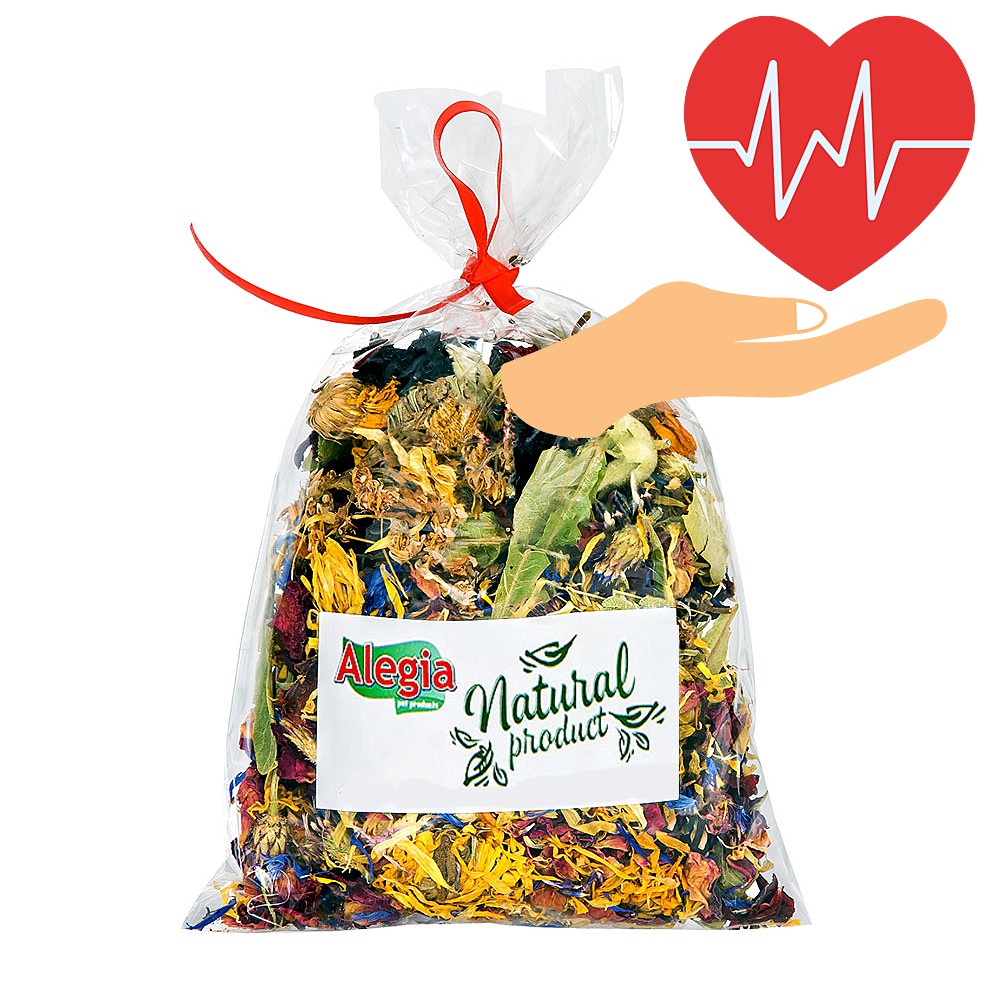 Skład: nagietek, hibiskus, kwiat malwy, chipsy marchewki, mącznik, płatki róży, chaber bławatek.