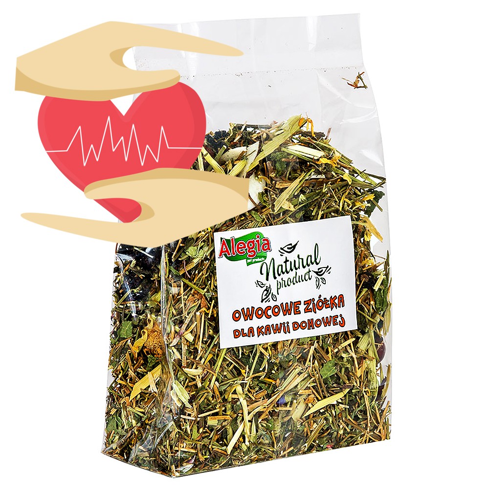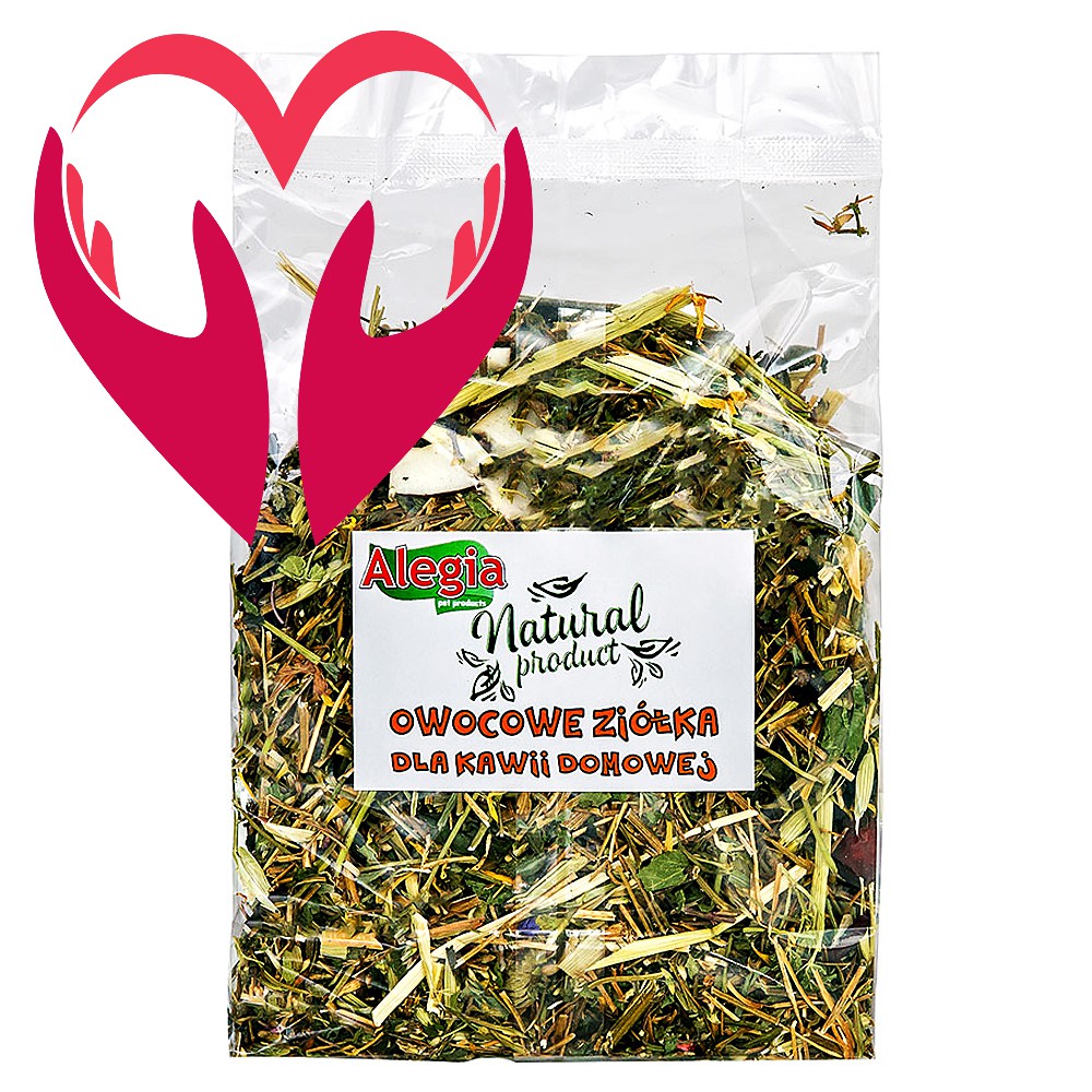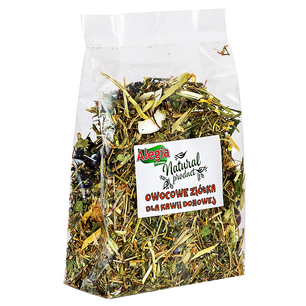 Owocowe Ziółka dla Kawii Domowej 130g Alegia, są to specjalnie przygotowana mieszanka ziół z dodatkiem owoców dla Kawii, duża zawartość włókien w zielu owsa, wpływa na prawidłowe trawienie, dodatkowo wzmacnia organizm.