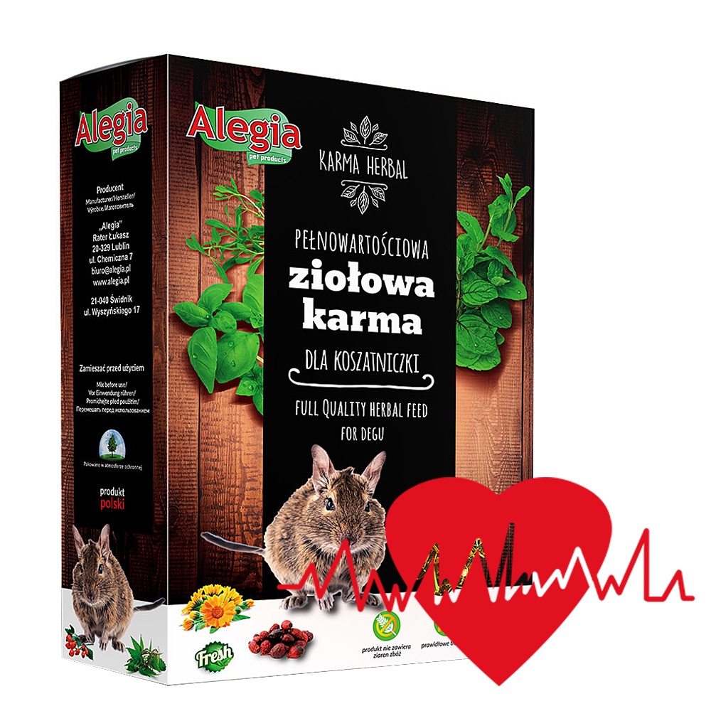 Dodatkowo, aby nie zniszczyć podczas procesów produkcyjnych struktury i właściwości ziół znajdujących się w Karmie Herbal, mieszanka pakowana jest ręcznie. Tak duża staranność przy doborze składników i pakowaniu każdego kartonika sprawia że Karma Alegia Herbal Koszatniczka dostarczy Twojemu Pupilowi wszystkiego, co najlepsze.