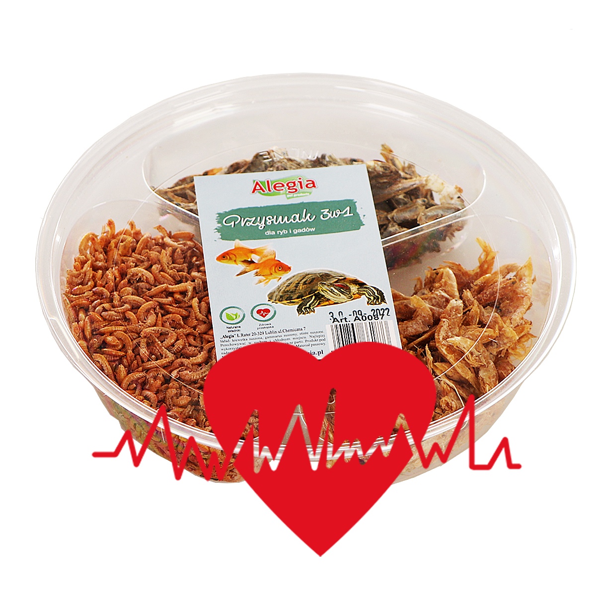 Alegia przysmak 3w1 dla gadów to idealny naturalna mieszanka krewetki, gammarusa oraz stinte. Krewetka suszona to naturalny pokarm bogaty w tłuszcze, sole mineralne oraz białko. Zawiera substancję balastowe – chitynę oraz korotenoidy, które wpływają na intensywność kolorów. Gammarus suszony to pokarm, który pochodzi prosto z natury, jest bogaty w białko, sole mineralne oraz tłuszcze. Zawiera duże ilości chityny, która reguluję pracę przewodu pokarmowego. Ponadto jest źródłem makro- i mikroelementów. Stinte (stynka) suszona to naturalny pokarm dla ryb mięsożernych, drapieżnych, żółwi oraz zwierząt potrzebujących naturalnego białka (m.in. chomiki, szczury). Ponadto bogaty jest w duże ilości białka oraz tłuszczu, które poprawiają kondycję zwierząt.