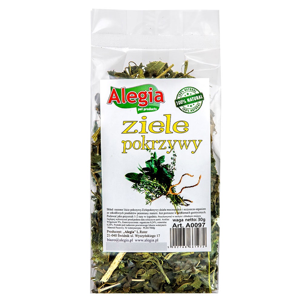 Alegia Ziele pokrzywy dla gryzoni i królików działa moczopędnie i oczyszczająco na organizm ze szkodliwych produktów przemiany materii, oraz zapobiega drobnym krwawieniom przewodu pokarmowego. Jest pomocna w problemach gastrycznych i obniża poziom cukru we krwi, szczególnie polecana dla Koszatniczek. Polecane w leczeniu chorób wątroby, dróg oddechowych i owrzodzeniach żołądka, wykazuję działanie wzmacniające.