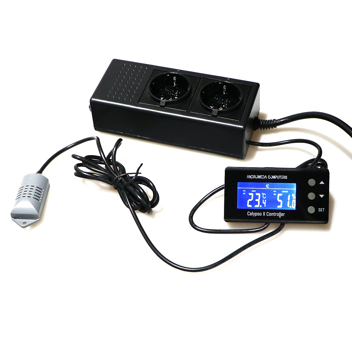 Jeden z kanałów scalony jest z higrostatem mikroprocesorowym. Oznacza to, że jedno z wyjść 230V może regulować wilgotność wewnątrz terrarium/akwarium/gworbox'ie i innych. higrostat może podnosić wilgotność lub obniżać ją, za pomocą odpowiednich urządzeń. Możesz ustalić inną wilgotność na dzień i na noc.