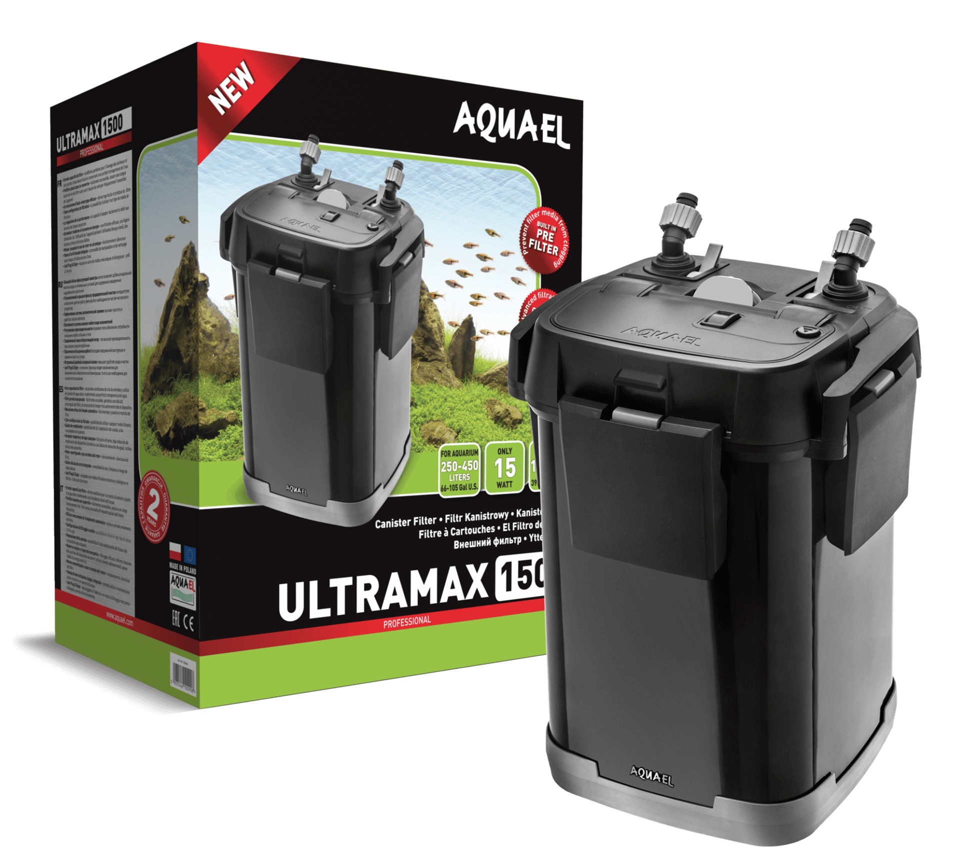 Wbudowany prefiltr – to nowość na rynku. W pokrywie każdego filtra ULTRAMAX znajduje się wbudowany duży prefiltr gąbkowy (ok. 0,6 l pojemności). Jego zadaniem jest wychwytywanie grubszych zanieczyszczeń mechanicznych zanim trafią one do wnętrza filtra. Dzięki temu skutecznie chroni urządzenie przed zapychaniem i pozwala ograniczyć częstotliwość konieczności jego czyszczenia do minimum. Zamiast tego wystarczy regularnie płukać gąbkę prefiltra w wodzie kranowej – zabieg ten zajmuje zaledwie kilka minut i nie wymaga odłączania filtra od zasilania ani wyjmowania go z szafki akwariowej.