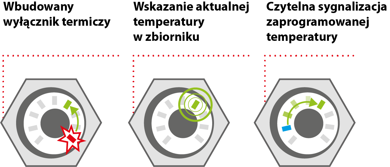 Do regulacji grzałki służy wyjątkowo wygodny system ONE-TOUCH składający się z pojedynczego przycisku i wieńca z diod LED wskazujących aktualną oraz zaprogramowaną temperaturę.