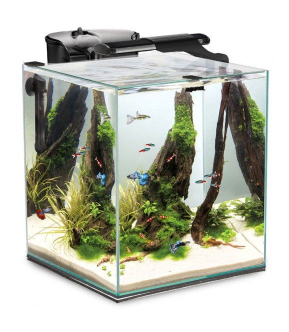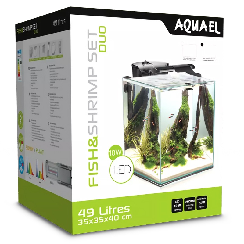 FISH&SHRIMP SET DUO składa się z nowoczesnego zbiornika klejonego transparentnym silikonem o kształcie zbliżonym do sześcianu i wymiarach 35x35x40 cm (pojemność 49 l) wyposażonego w szklaną pokrywę z wycięciem do instalacji filtra kaskadowego. W jego skład wchodzi również ochronna mata gąbkowa, zabezpieczająca dno.