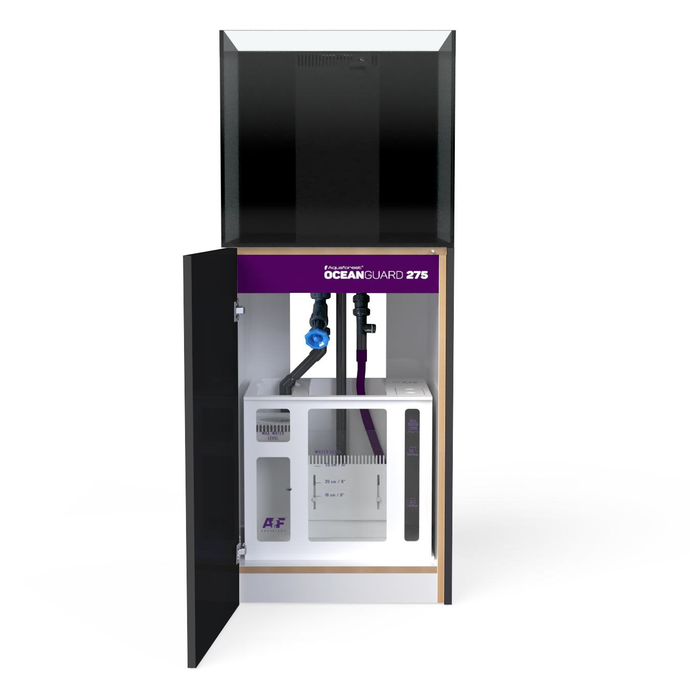Całości dopełnia solidny sump z PVC osadzony na niwelującej drgania piance. Zdecydowaliśmy się na zastosowanie PVC zamiast szkła nie tylko ze względu na nowoczesny wygląd, ale również po to, by uzyskać najwyższą szczelność i trwałość. Ponadczasowy design sumpa to również precyzyjne oznaczenia poziomów wody, które ułatwiają odpowiednie ustawienie sprzętu. Komory kaskadowe wyposażyliśmy w skarpety filtracyjne, które w dowolnej chwili możesz wymienić na reaktory mediów Aquaforest. Zawór zwrotny zapobiega zlewaniu się wody do sumpa, np. w przypadku awarii pompy obiegowej, czy chwilowego braku zasilania.