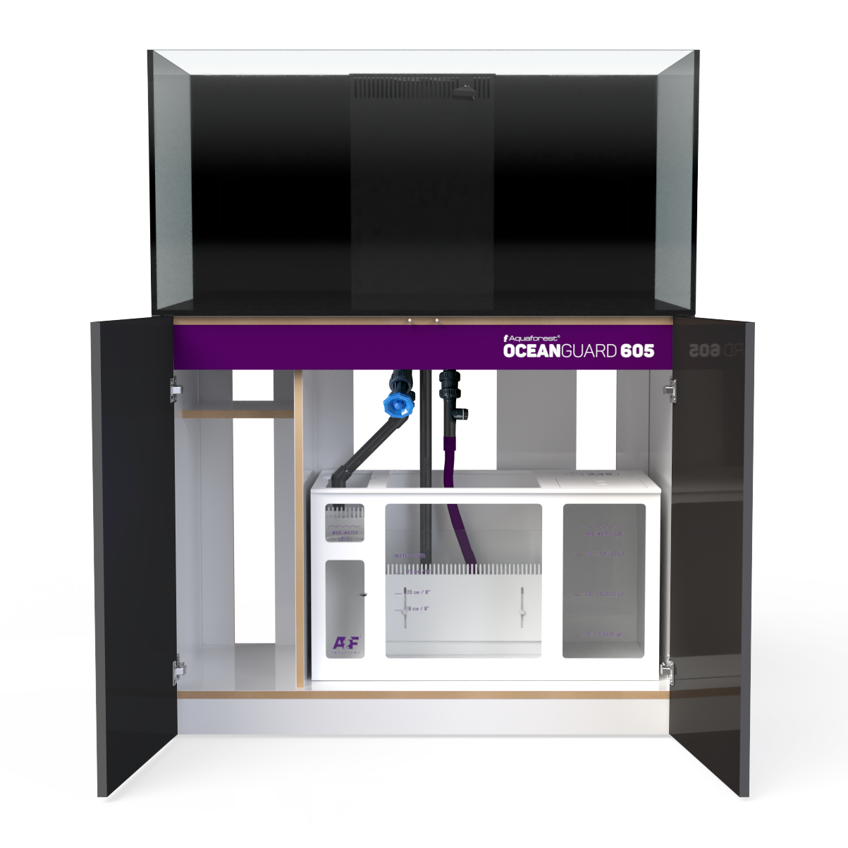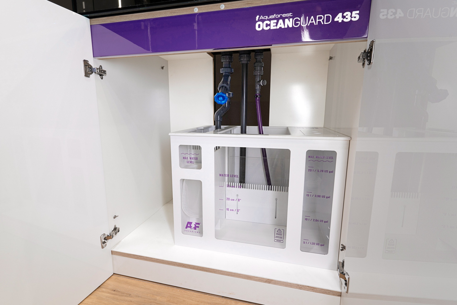 Całości dopełnia solidny sump z PVC osadzony na niwelującej drgania piance. Zdecydowaliśmy się na zastosowanie PVC zamiast szkła nie tylko ze względu na nowoczesny wygląd, ale również po to, by uzyskać najwyższą szczelność i trwałość. Ponadczasowy design sumpa to również precyzyjne oznaczenia poziomów wody, które ułatwiają odpowiednie ustawienie sprzętu. Komory kaskadowe wyposażyliśmy w skarpety filtracyjne, które w dowolnej chwili możesz wymienić na reaktory mediów Aquaforest. Zawór zwrotny zapobiega zlewaniu się wody do sumpa, np. w przypadku awarii pompy obiegowej, czy chwilowego braku zasilania.