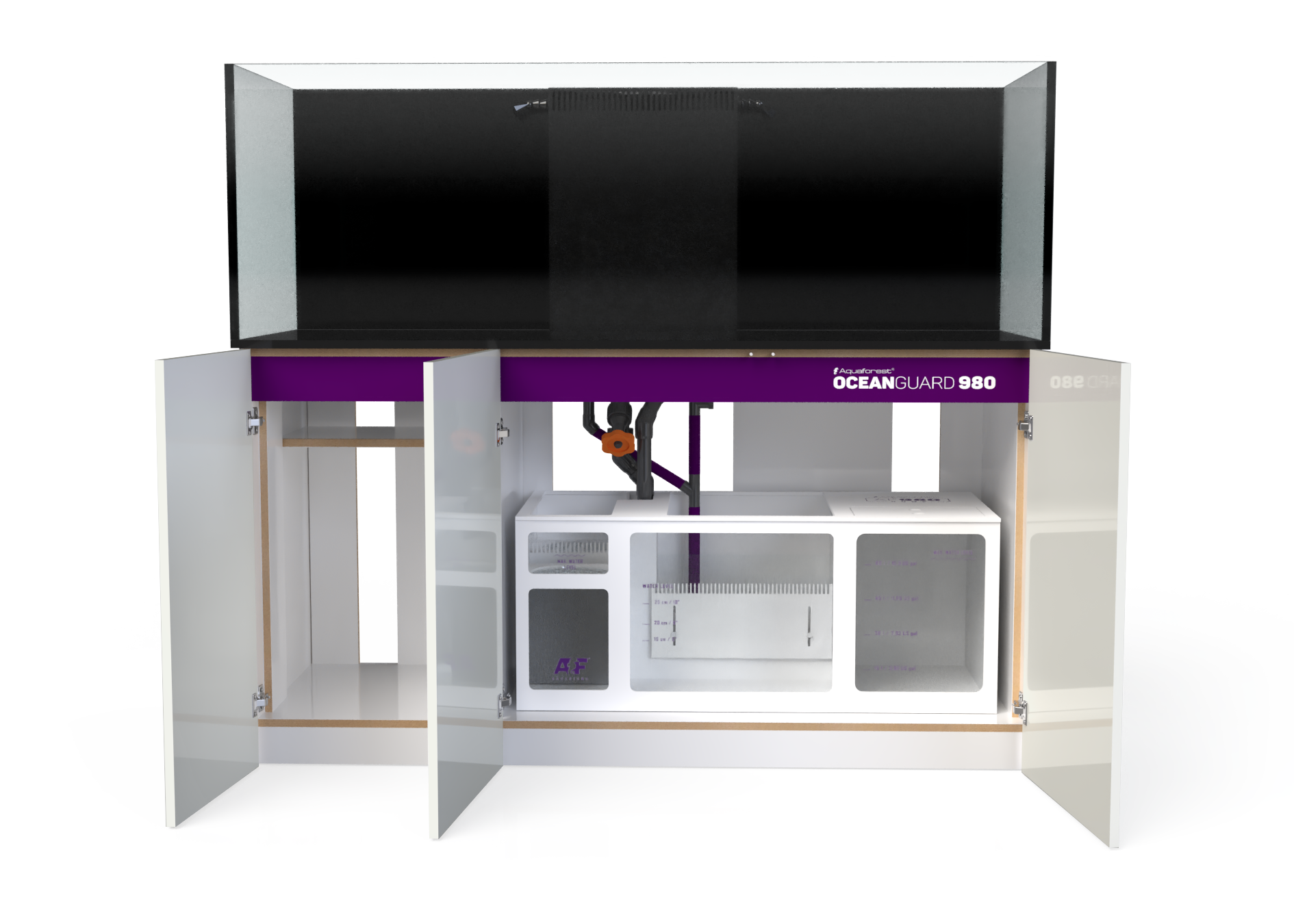Całości dopełnia solidny sump z PVC osadzony na niwelującej drgania piance. Zdecydowaliśmy się na zastosowanie PVC zamiast szkła nie tylko ze względu na nowoczesny wygląd, ale również po to, by uzyskać najwyższą szczelność i trwałość. Ponadczasowy design sumpa to również precyzyjne oznaczenia poziomów wody, które ułatwiają odpowiednie ustawienie sprzętu. Komory kaskadowe wyposażyliśmy w skarpety filtracyjne, które w dowolnej chwili możesz wymienić na reaktory mediów Aquaforest. Zawór zwrotny zapobiega zlewaniu się wody do sumpa, np. w przypadku awarii pompy obiegowej, czy chwilowego braku zasilania.