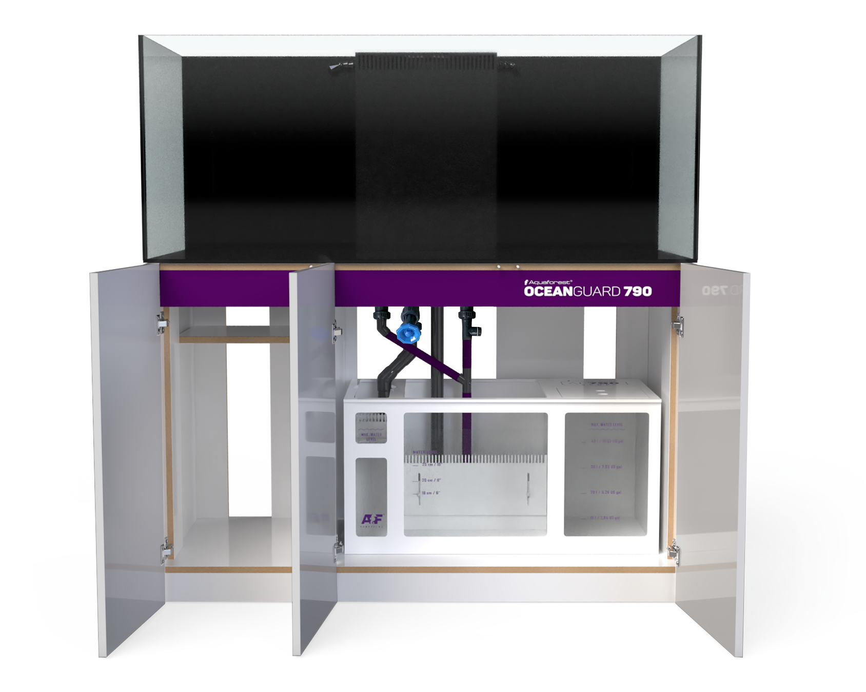 Całości dopełnia solidny sump z PVC osadzony na niwelującej drgania piance. Zdecydowaliśmy się na zastosowanie PVC zamiast szkła nie tylko ze względu na nowoczesny wygląd, ale również po to, by uzyskać najwyższą szczelność i trwałość. Ponadczasowy design sumpa to również precyzyjne oznaczenia poziomów wody, które ułatwiają odpowiednie ustawienie sprzętu. Komory kaskadowe wyposażyliśmy w skarpety filtracyjne, które w dowolnej chwili możesz wymienić na reaktory mediów Aquaforest. Zawór zwrotny zapobiega zlewaniu się wody do sumpa, np. w przypadku awarii pompy obiegowej, czy chwilowego braku zasilania.