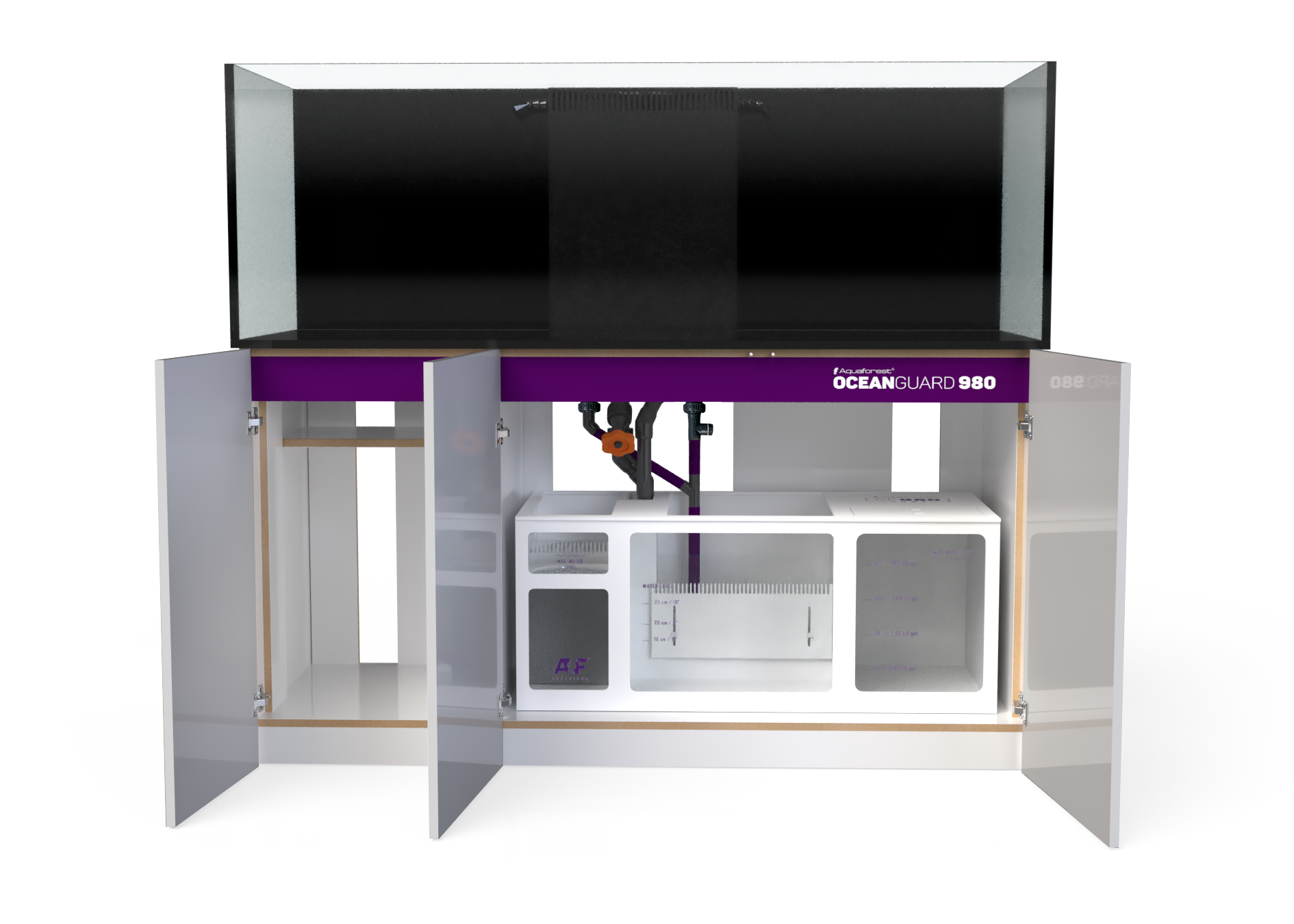Całości dopełnia solidny sump z PVC osadzony na niwelującej drgania piance. Zdecydowaliśmy się na zastosowanie PVC zamiast szkła nie tylko ze względu na nowoczesny wygląd, ale również po to, by uzyskać najwyższą szczelność i trwałość. Ponadczasowy design sumpa to również precyzyjne oznaczenia poziomów wody, które ułatwiają odpowiednie ustawienie sprzętu. Komory kaskadowe wyposażyliśmy w skarpety filtracyjne, które w dowolnej chwili możesz wymienić na reaktory mediów Aquaforest. Zawór zwrotny zapobiega zlewaniu się wody do sumpa, np. w przypadku awarii pompy obiegowej, czy chwilowego braku zasilania.
