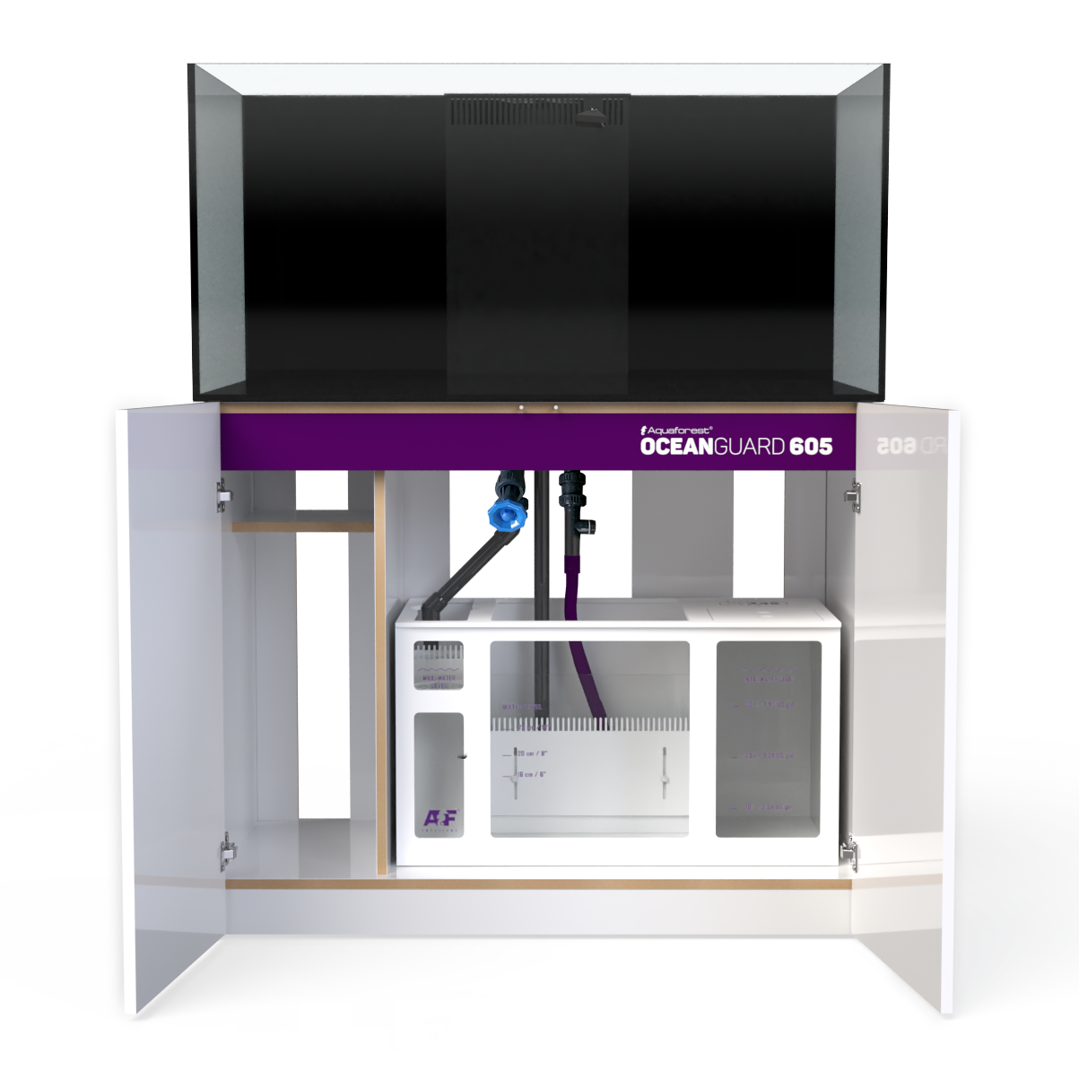 Całości dopełnia solidny sump z PVC osadzony na niwelującej drgania piance. Zdecydowaliśmy się na zastosowanie PVC zamiast szkła nie tylko ze względu na nowoczesny wygląd, ale również po to, by uzyskać najwyższą szczelność i trwałość. Ponadczasowy design sumpa to również precyzyjne oznaczenia poziomów wody, które ułatwiają odpowiednie ustawienie sprzętu. Komory kaskadowe wyposażyliśmy w skarpety filtracyjne, które w dowolnej chwili możesz wymienić na reaktory mediów Aquaforest. Zawór zwrotny zapobiega zlewaniu się wody do sumpa, np. w przypadku awarii pompy obiegowej, czy chwilowego braku zasilania.