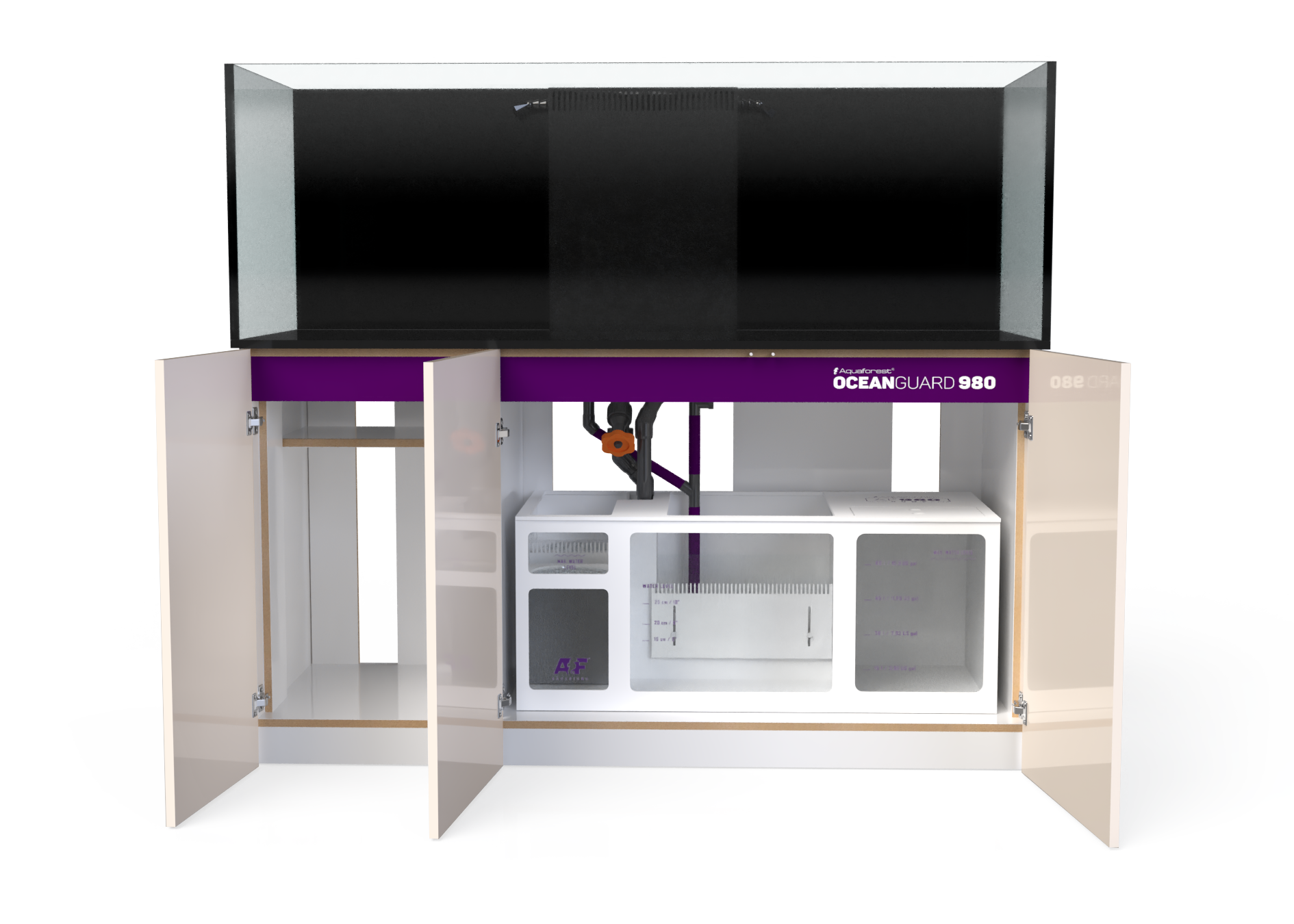 Całości dopełnia solidny sump z PVC osadzony na niwelującej drgania piance. Zdecydowaliśmy się na zastosowanie PVC zamiast szkła nie tylko ze względu na nowoczesny wygląd, ale również po to, by uzyskać najwyższą szczelność i trwałość. Ponadczasowy design sumpa to również precyzyjne oznaczenia poziomów wody, które ułatwiają odpowiednie ustawienie sprzętu. Komory kaskadowe wyposażyliśmy w skarpety filtracyjne, które w dowolnej chwili możesz wymienić na reaktory mediów Aquaforest. Zawór zwrotny zapobiega zlewaniu się wody do sumpa, np. w przypadku awarii pompy obiegowej, czy chwilowego braku zasilania.