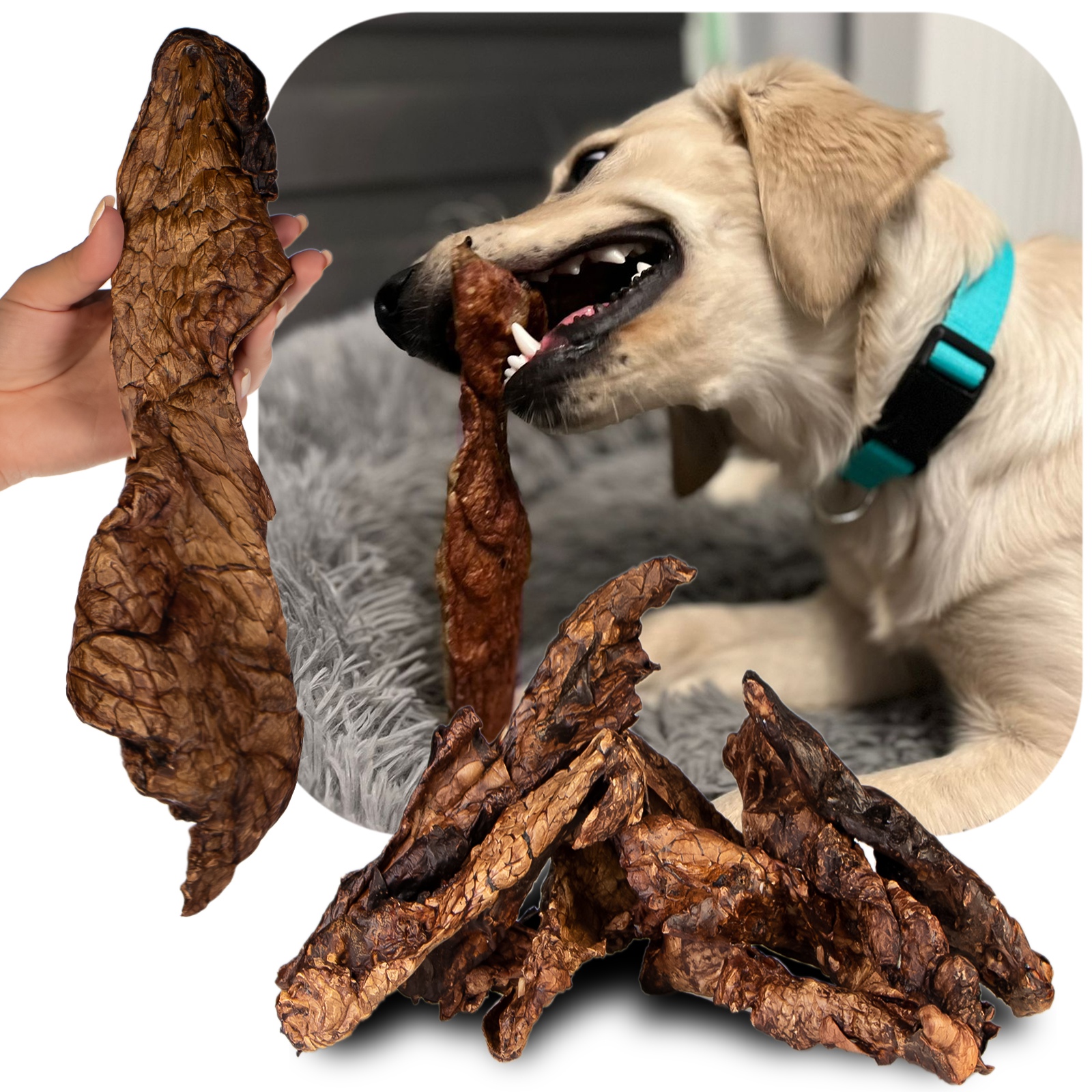 Płuco ma bardzo unikalną budowę. Z natury jest "gąbczaste" ale po suszeniu robi się nieco "gumowate". Dlatego właśnie jest świetnym materiałem do głębokiego czyszczenia zębów, a nawet dziąseł. Ząbek psa zapada się mięsie zanim je przetnie i jest czyszczone w całości i dookoła. Nie jest trudnym i twardym materiałem - odpowiednie dla seniorów i szczeniaków. Dla każdego od najmniejszego po dużego psa.
