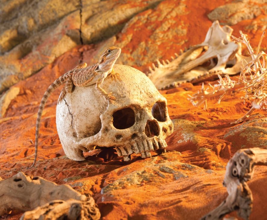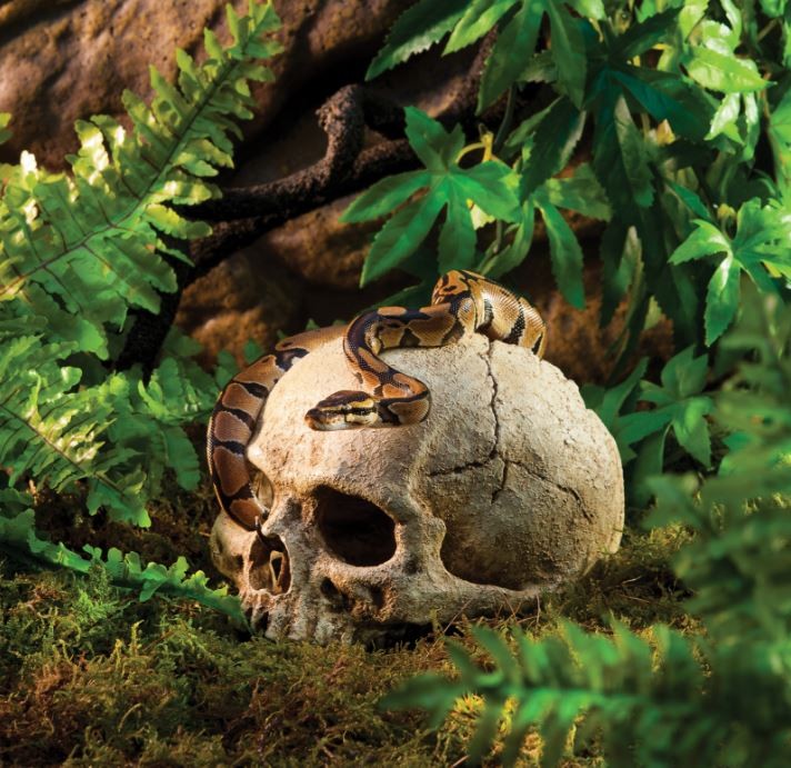 Liczne kryjówki w wybiegu eliminują stres pupila, chronią zwierze przed nadmiernym przegrzaniem oraz stymulują zachowania rozrodcze. Produkt, wykonany z odpornej na uszkodzenia oraz wilgoć żywicy, pokrytej nietoksycznym tworzywem, do złudzenia przypomina prawdziwą czaszkę. Ozdoba jest ciężka, zapewniając stabilność kryjówki, nawet pod naporem energicznych i ciężkich pupili. Wysokiej jakości laminat upraszcza czyszczenie oraz dezynfekcje.