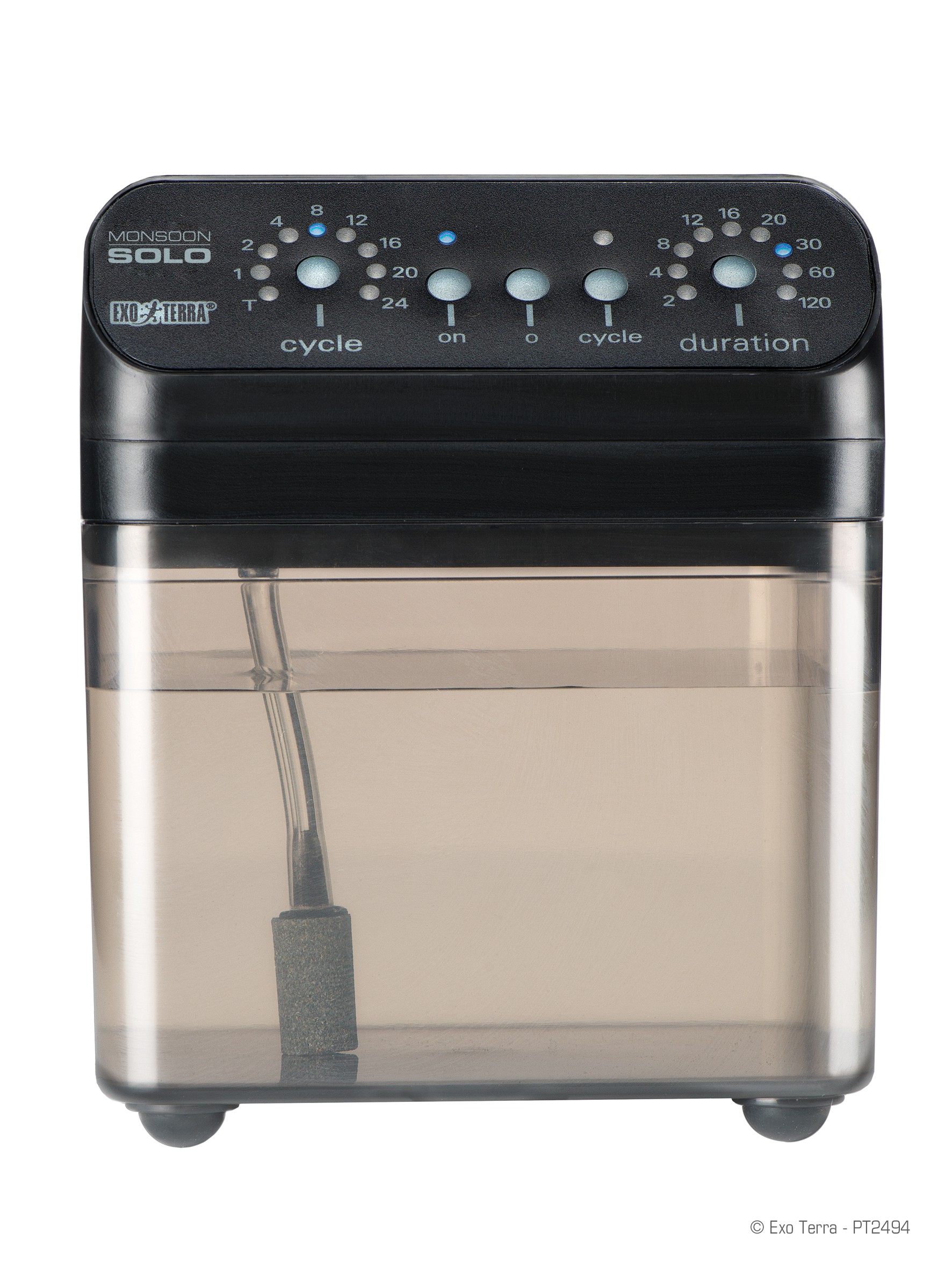 Exo Terra Monsoon Solo wyposażony jest w 1 łatwą w instalacji dyszę, ale system można rozszerzyć do 2 dysz, dzięki czemu idealnie nadaje się do 2 terrariów lub do terrarium o średniej ub dużej kubaturze. Mgła wytwarzana przez te specjalnie zaprojektowane dysze jest wyjątkowo cienka, tworząc efekt mgły w terrarium, a wyjątkowo długie rurki umożliwiają aby ukryć urządzenie w schowku lub pod terrarium w szafce.