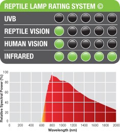 Czerwone szkło przekazuje fale podczerwone wytwarzane przez żarnik żarówki. Czerwone światło jest niewidzialne dla zwierząt, więc nie zakłóca ich naturalnego cyklu dobowego dzień/noc przez co, jest idealne do stosowania przez całą dobę, co z kolei umożliwia obserwacje pupila nawet w nocy. Wnętrze żarówki posiada powłokę refleksyjną, która skupia generowane przez nią promieniowanie. Pozwala to skierować strumień promieniowania cieplnego w konkretnym kierunku, dzięki czemu możemy tworzyć tzw. wyspy ciepła w terrarium. Ciepło pochodzące z żarówki pozytywnie wpływa na rozwój pupila, tj. trawienie, aktywność, stymuluje zachowania rozrodcze. Fale emitowane wspierają rozrost kostny oraz przyśpieszaja gojenie ran.