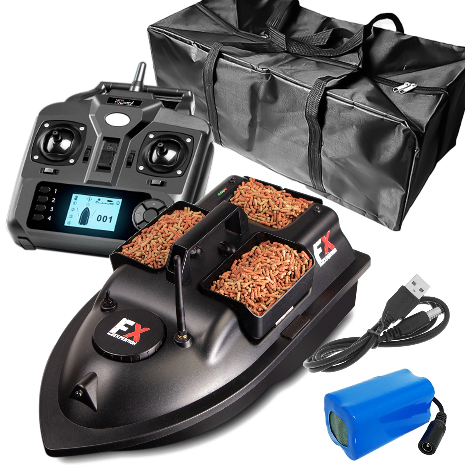 W zestawie: łódka zanętowa, pilot, bateria, kabel USB do ładowania, torba na łódź (w zestawie nie ma "kostki" 230V na USB do ładowania zgodnie z wytycznymi UE)