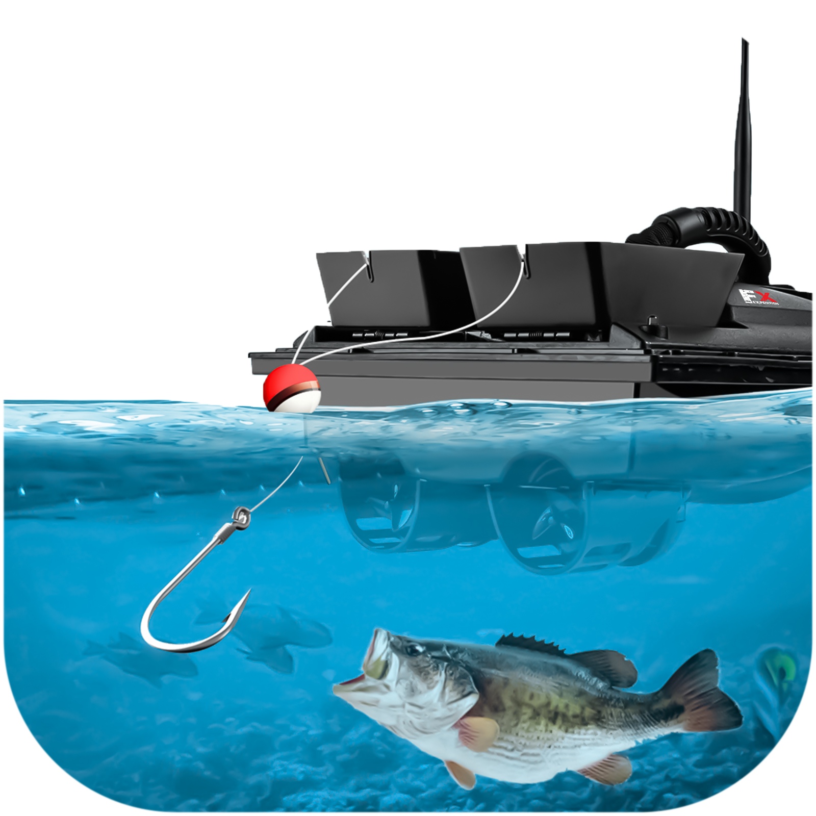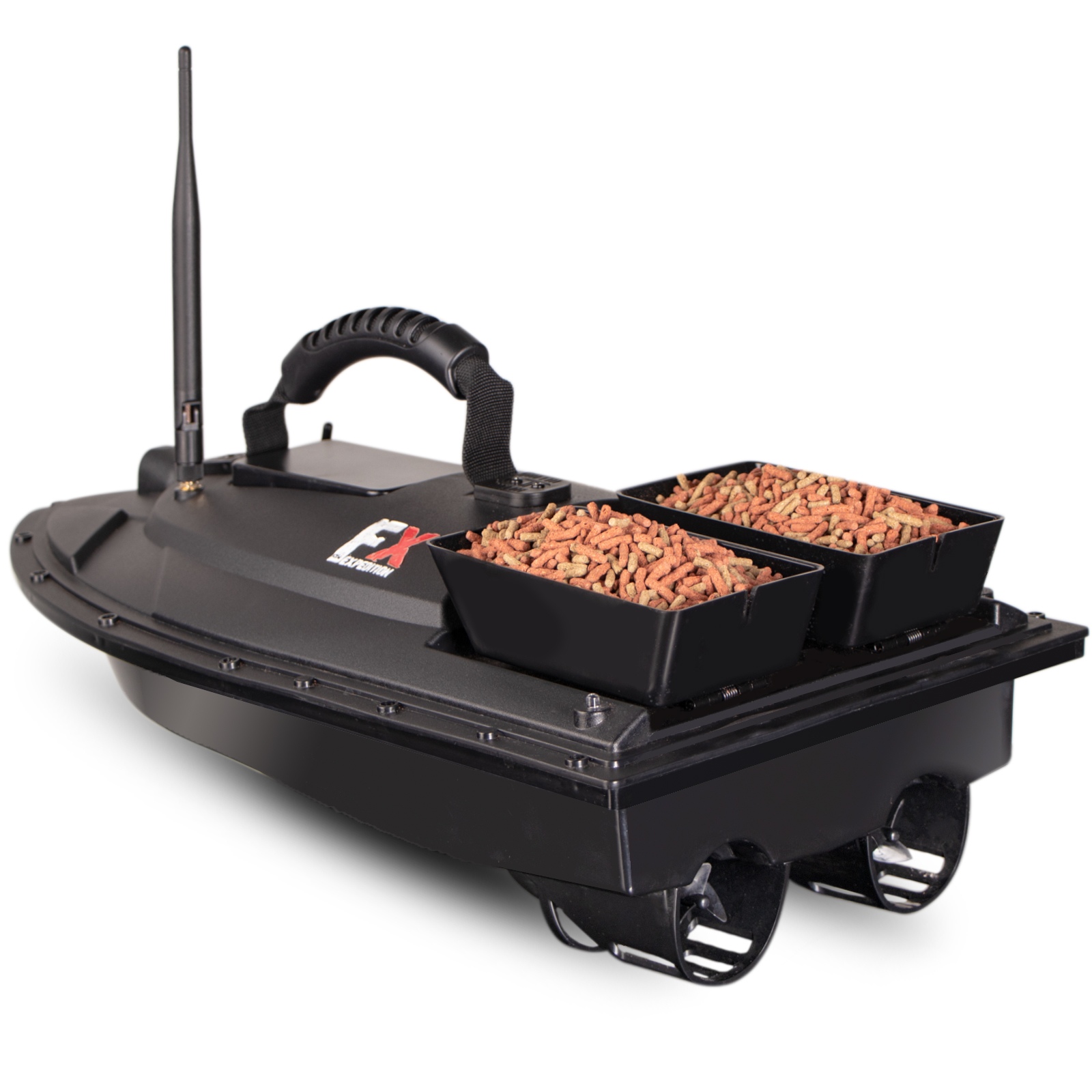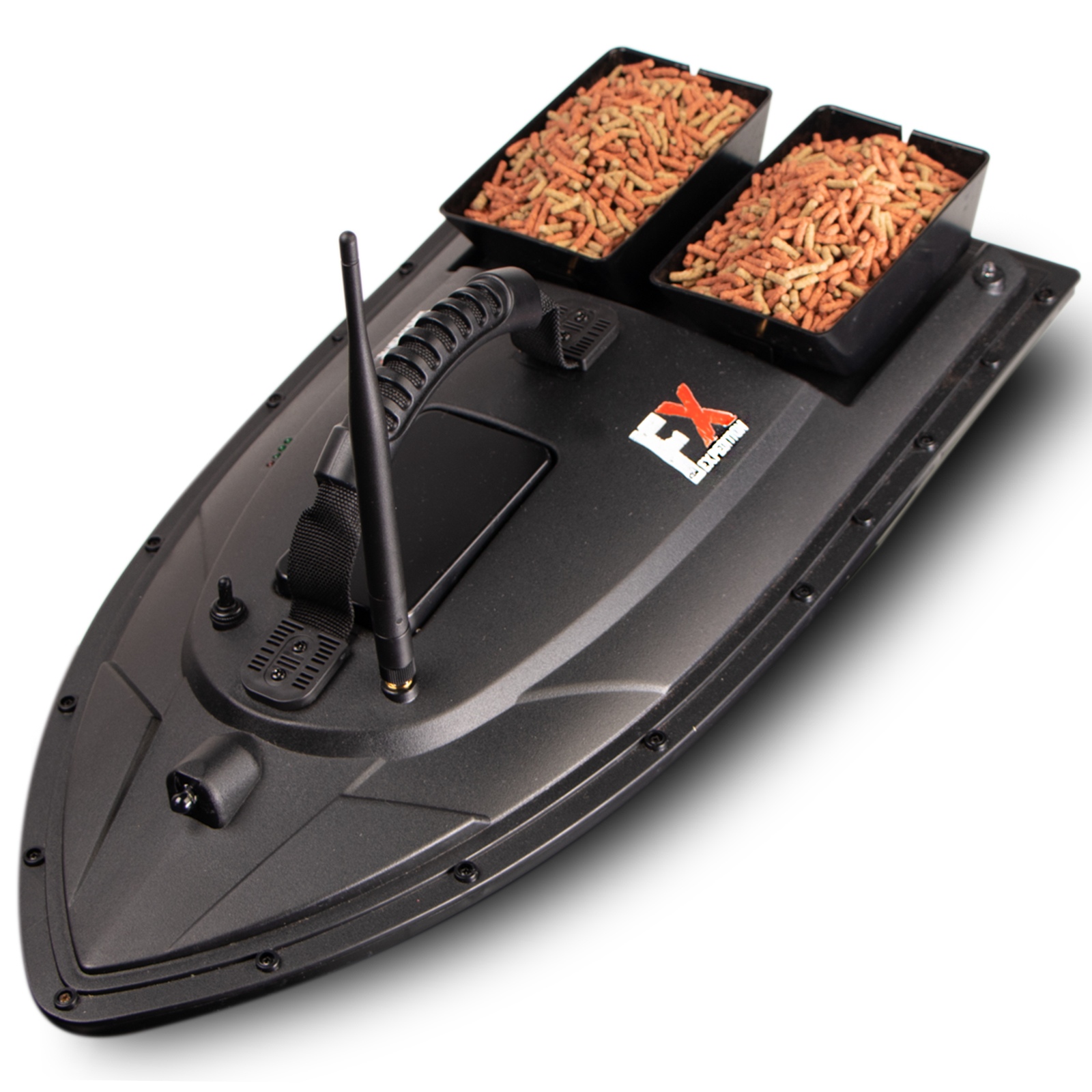 Łódka posiada dwa zbiorniki, które łącznie pomieszczą do 1,5kg przynęty, aby przyciągnąć ławicę ryb. Zbiornikami możesz sterować osobno. Dodatkowo w tylnej części łódki znajduje się specjalne miejsce do zamontowania haka z przynętą. Z dobrym wyposażeniem z łatwością przekonasz ryby, że Twój hak to najlepszy posiłek w okolicy.