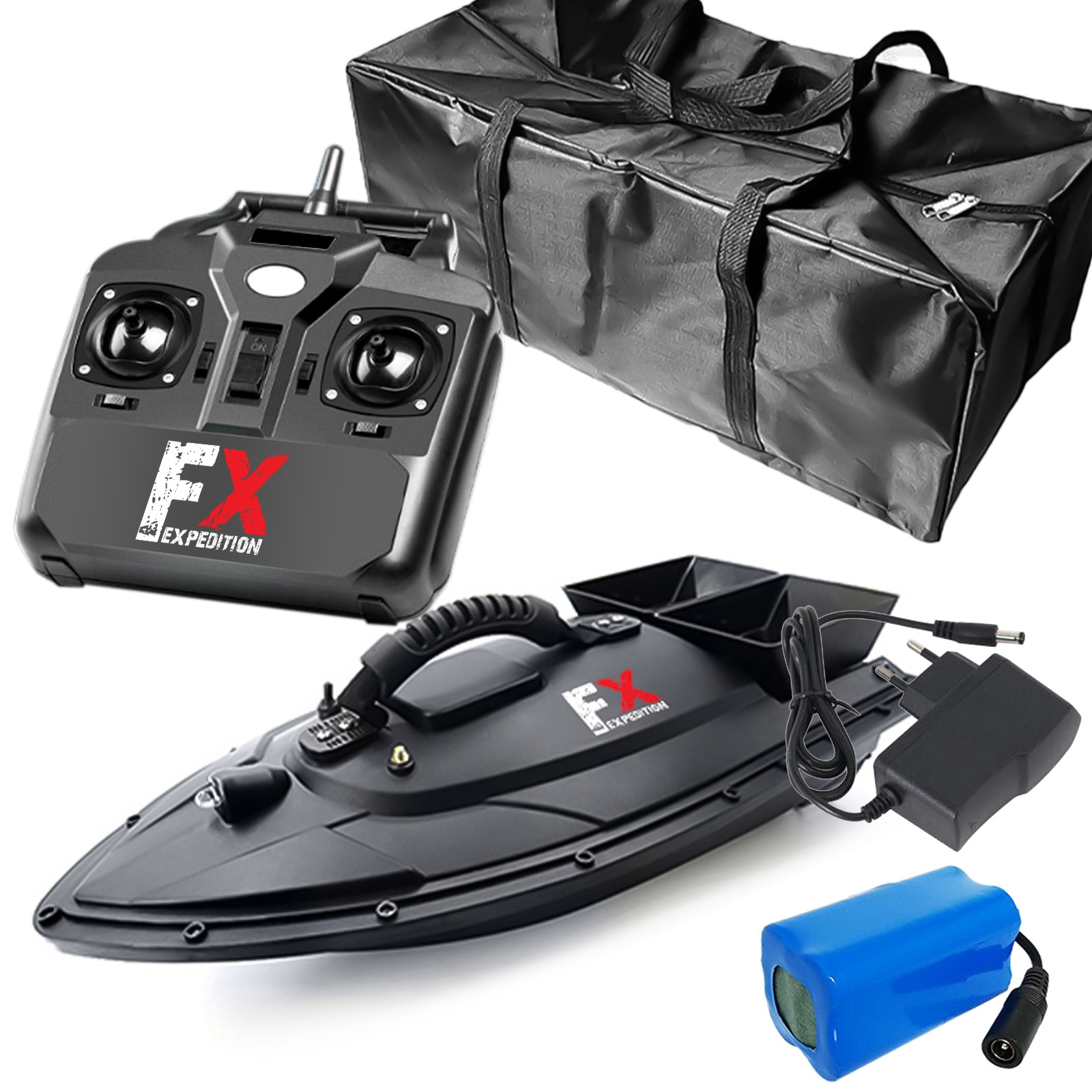 W zestawie: łódka zanętowa, pilot, bateria, ładowarka, torba na łódź