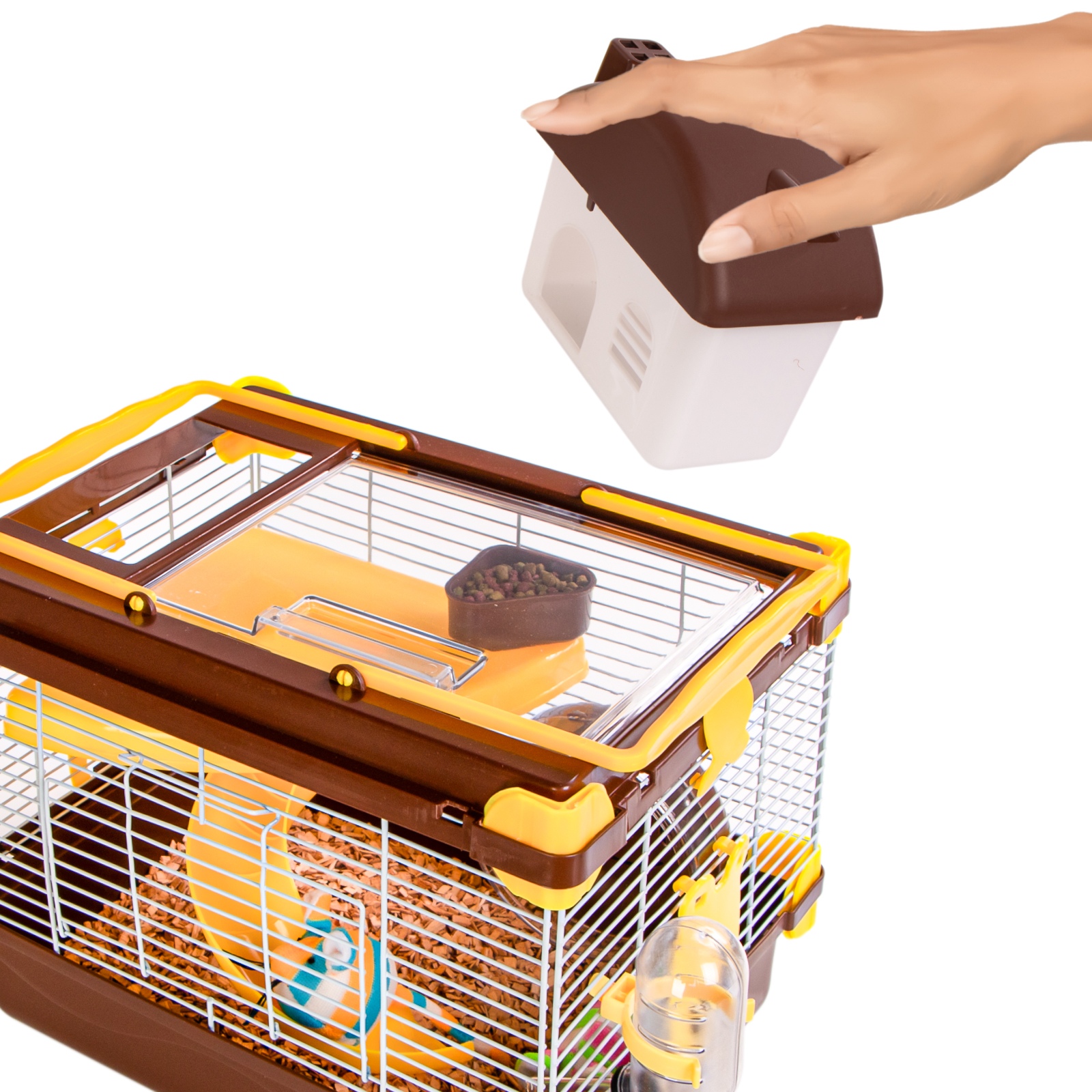- Wyjmowany domek w całości: Bez konieczności otwierania klatki. Czyli szybki sposób na sprzątanie.
