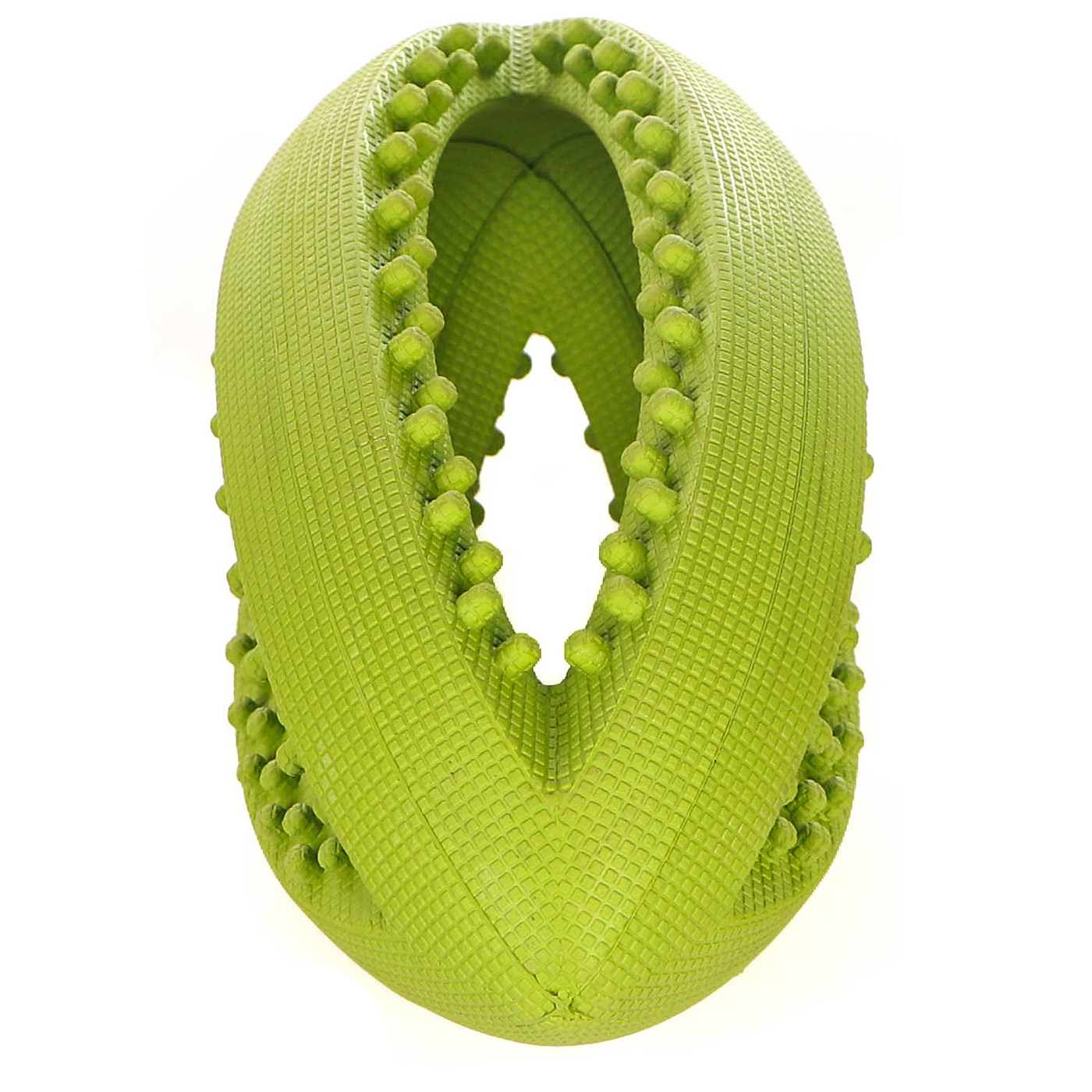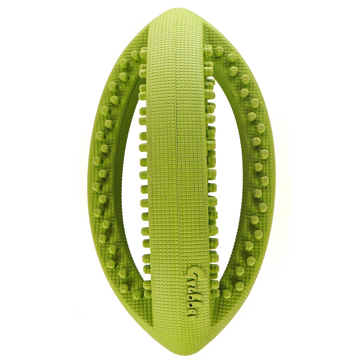 Gumowa piłka w kształcie piłki do rugby, dla naszych pupilów zaprojektowana została z myślą o właścicielach aktywnych psów. Wykonana zastała z mocnej odpornej gumy, niewypełniona w środku. Dzięki nieregularnemu kształtowi piłka odbija się w nieprzewidywanym dla psa kierunku, zachęcając go do biegania za piłką, a zarazem do aktywnego treningu. W konstrukcji zabawki są wypustki które podczas zabawy masują dziąsła zwierzaka. Zabawkę można wykorzystać do różnych zabaw z pupilem np. jako aport, gryzak.