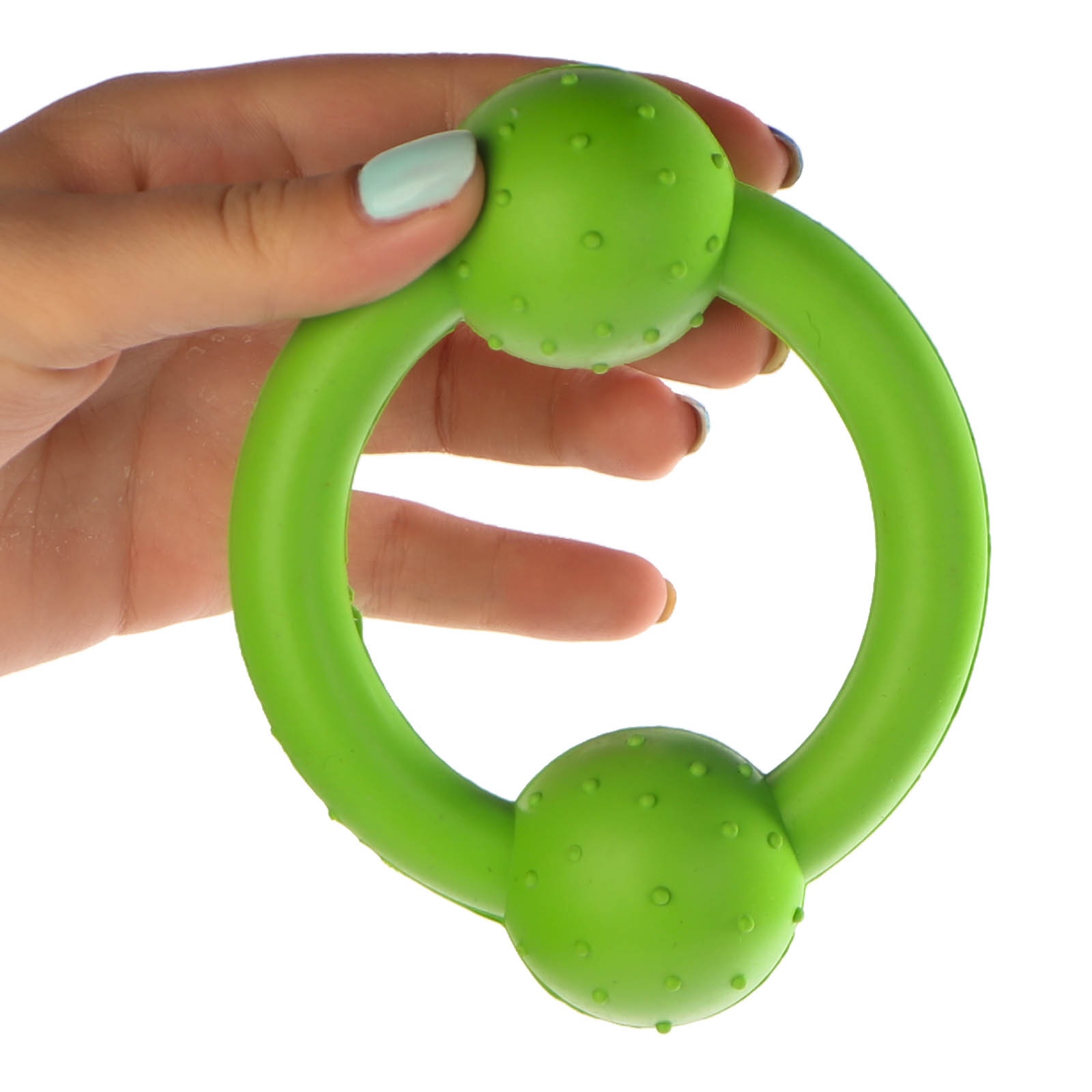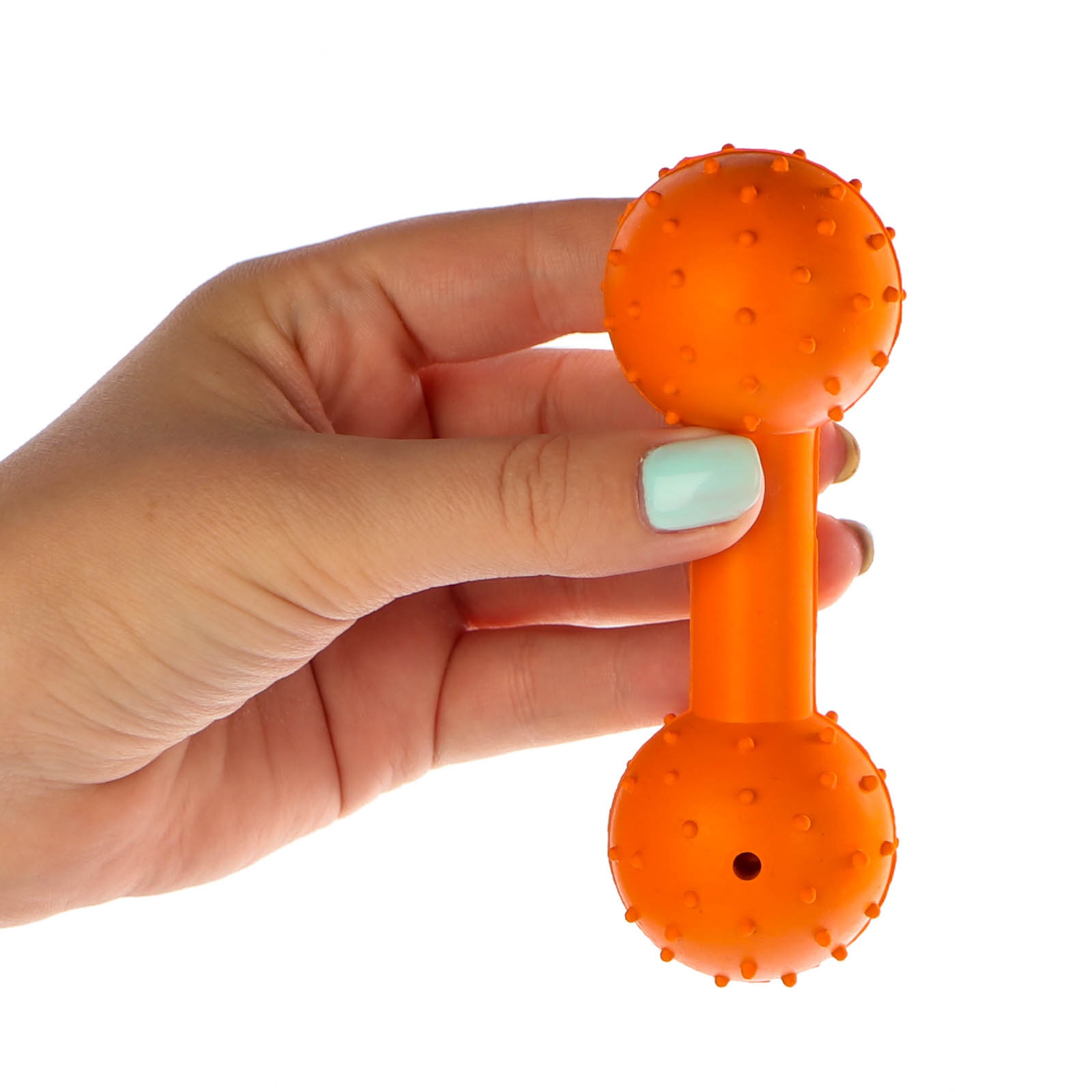 Zewnętrzna struktura gryzaka jest mocno chropowata. Twój psiak wybada to jęzorem. Jeszcze bardziej go to zmotywuje do kłapania paszczą i sprawdzania, gdzie jeszcze zabawkę można ugryźć.