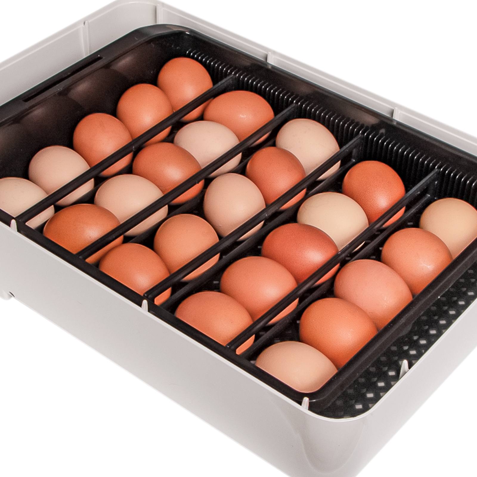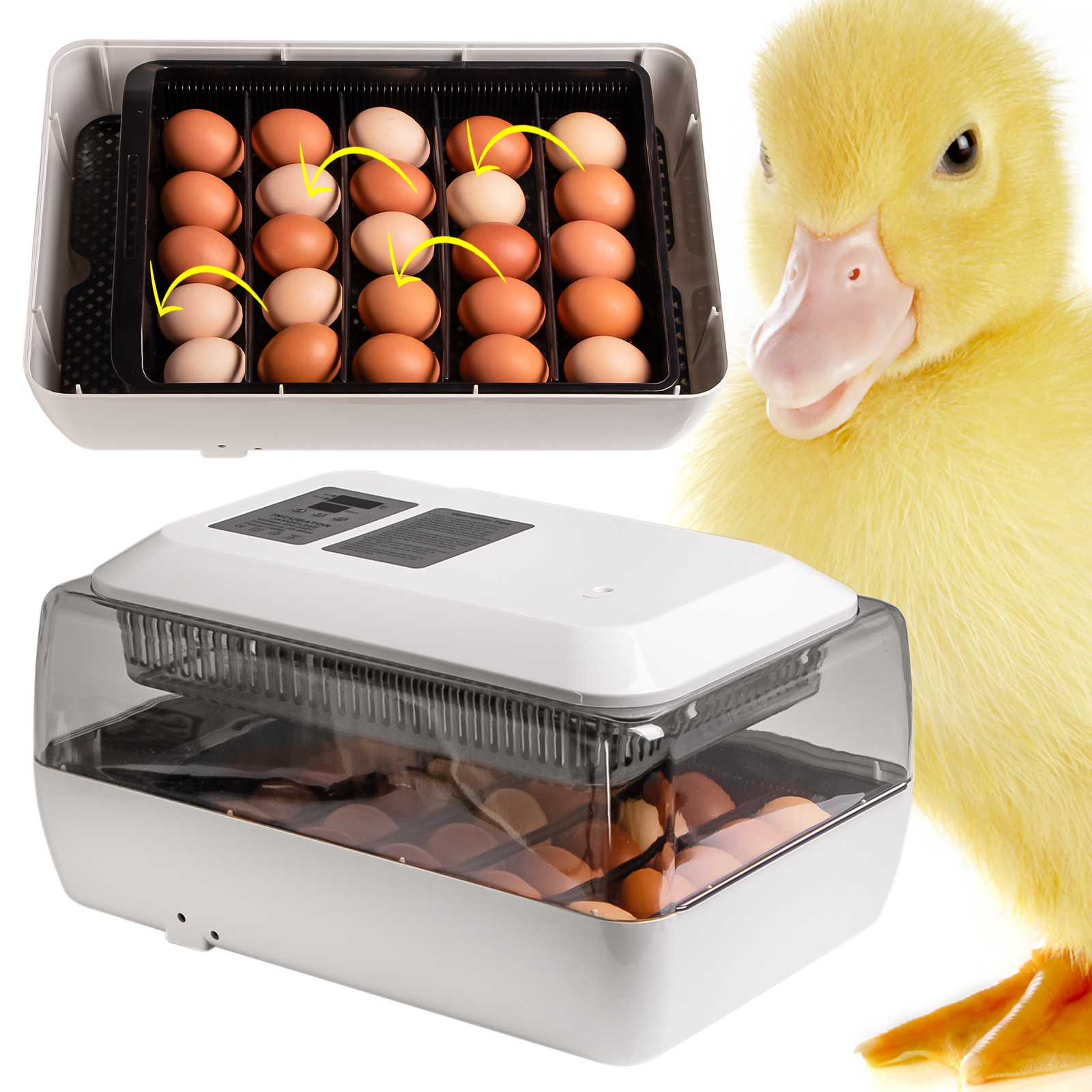 Wylęgarnia posiada wbudowany silniczek, który będzie poruszał kratką wewnątrz pojemnika. Tym samym jajka będą się obracać.
