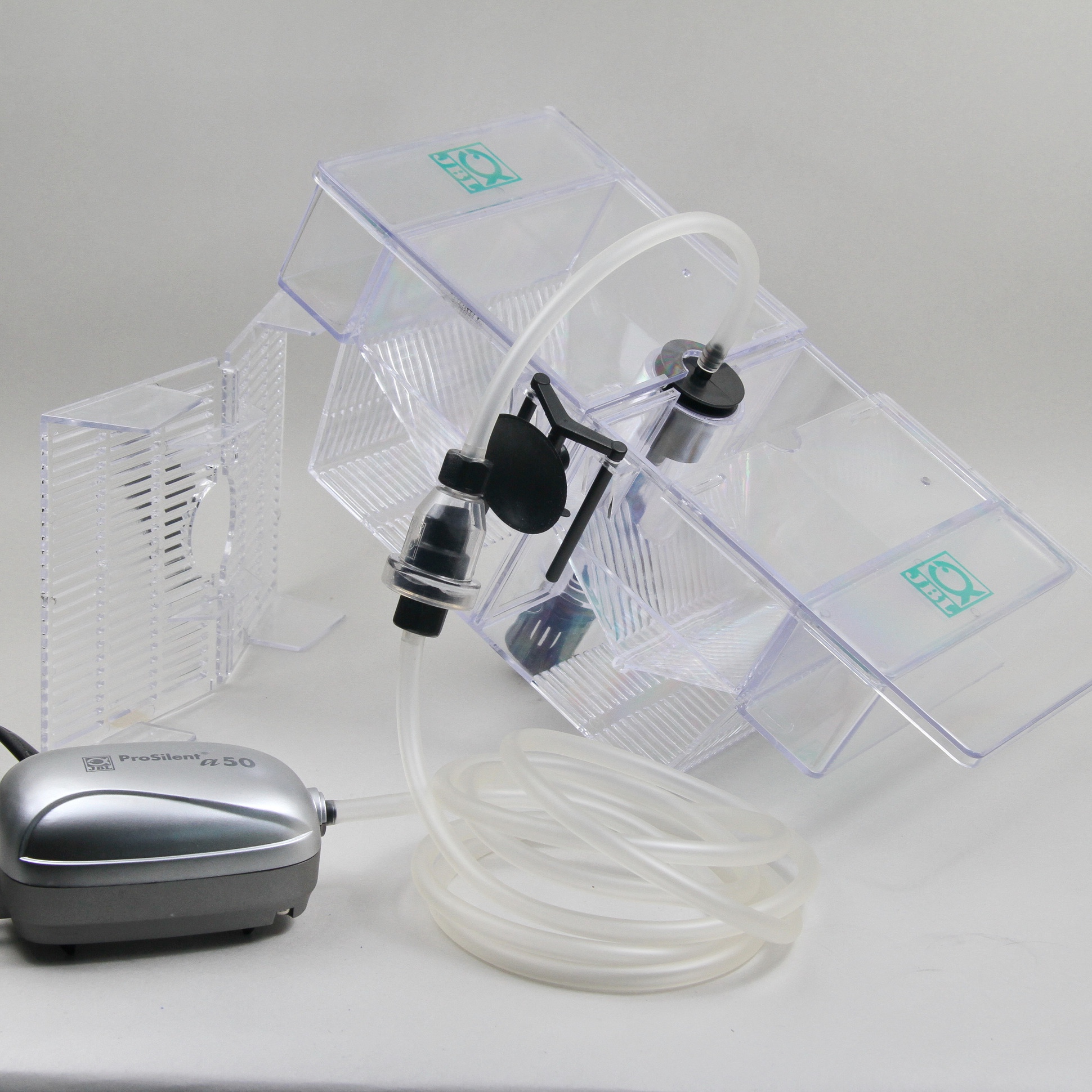 Nadaje się do otwartych akwariów i akwariów ze szklaną pokrywą. Kompletny zestaw, do natychmiastowego użycia Montaż koszyka ssawnego za pomocą ćwierci obrotu zgodnie z ruchem wskazówek zegara w otworze w dnie kotnika. Zamontować okrągły wypływ wody na górnym końcu rury wznośnej. Wąż powietrza połączyć z przyłączem powietrza przy wypływie wody. Umieścić kotnik w przewidzianym miejscu. Wąż powietrza podłączyć do pompki powietrza, podłączyć pompkę powietrza do prądu.