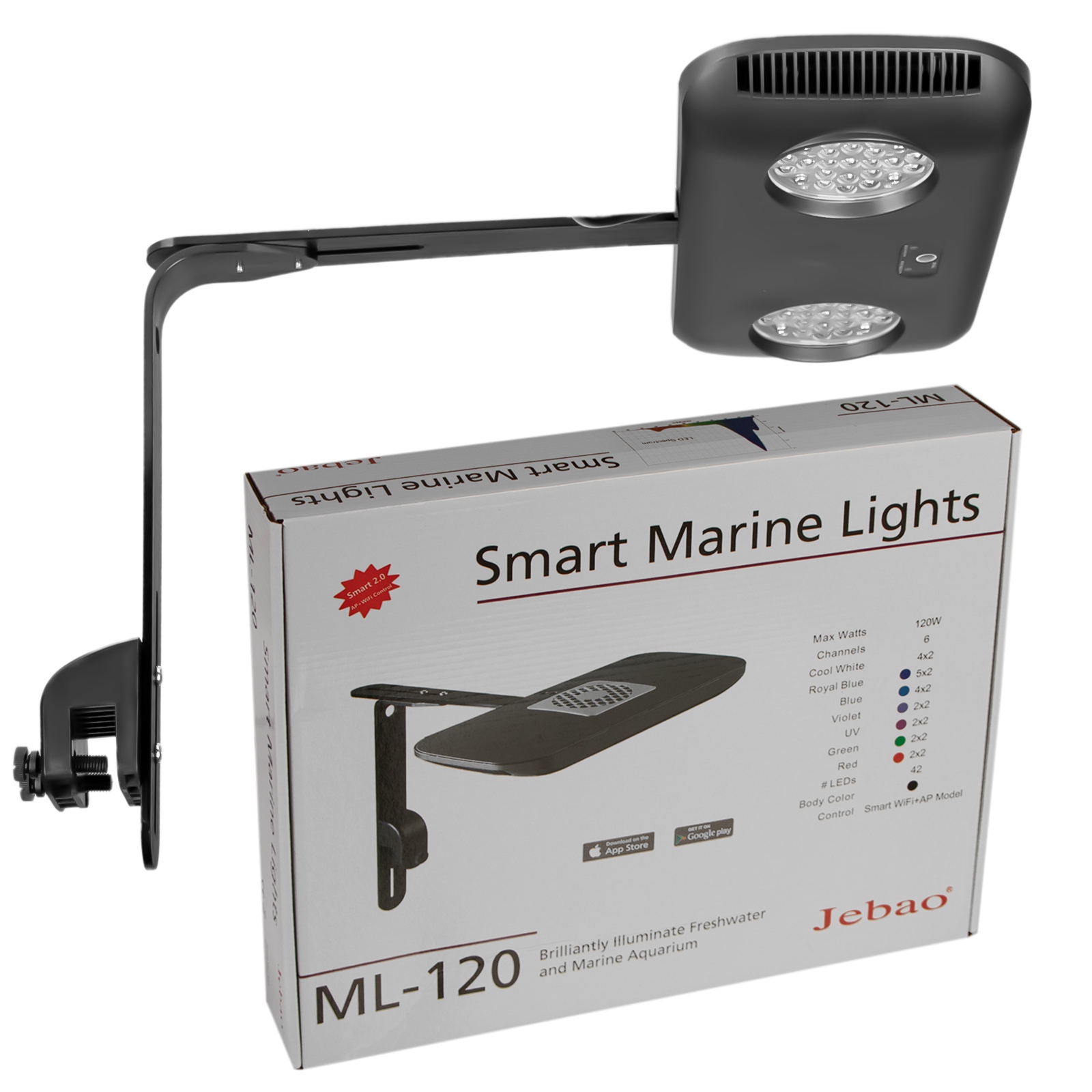 Lampa Jebao ML-120 doskonale imituje światło naturalne dla ryb, koralowców i innych stworzeń morskich. Lampa zawiera 6 kanałów kolorystycznych diod LED w tym białe, niebieskie, fioletowe, a także diody w kolorze zielonym i czerwonym. Jasność oraz efekty oświetleniowe każdego z kanałów LED można ustawić indywidualnie i kontrolować za pomocą aplikacji, dzięki czemu bez trudu odwzorujesz warunki niczym na dnie morza.