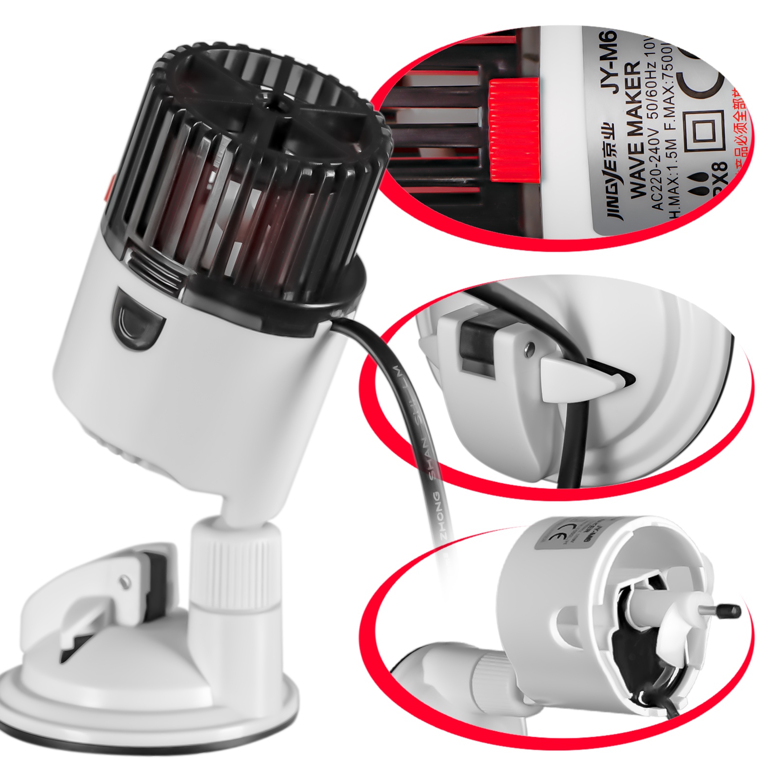 Pompa montowana jest na miękkiej dużej przyssawce z naciągaczem podobnym do przyssawek w samochodowych GPS. Wewnątrz przyssawki znajduje się kulowy przegub, który umożliwia ułożenie pompy w dowolnym kierunku. Co więcej przyssawka posiada uchwyty na kabel, co często jest dość istotne, zwłaszcza w miejscu gdzie woda płynie szybko.