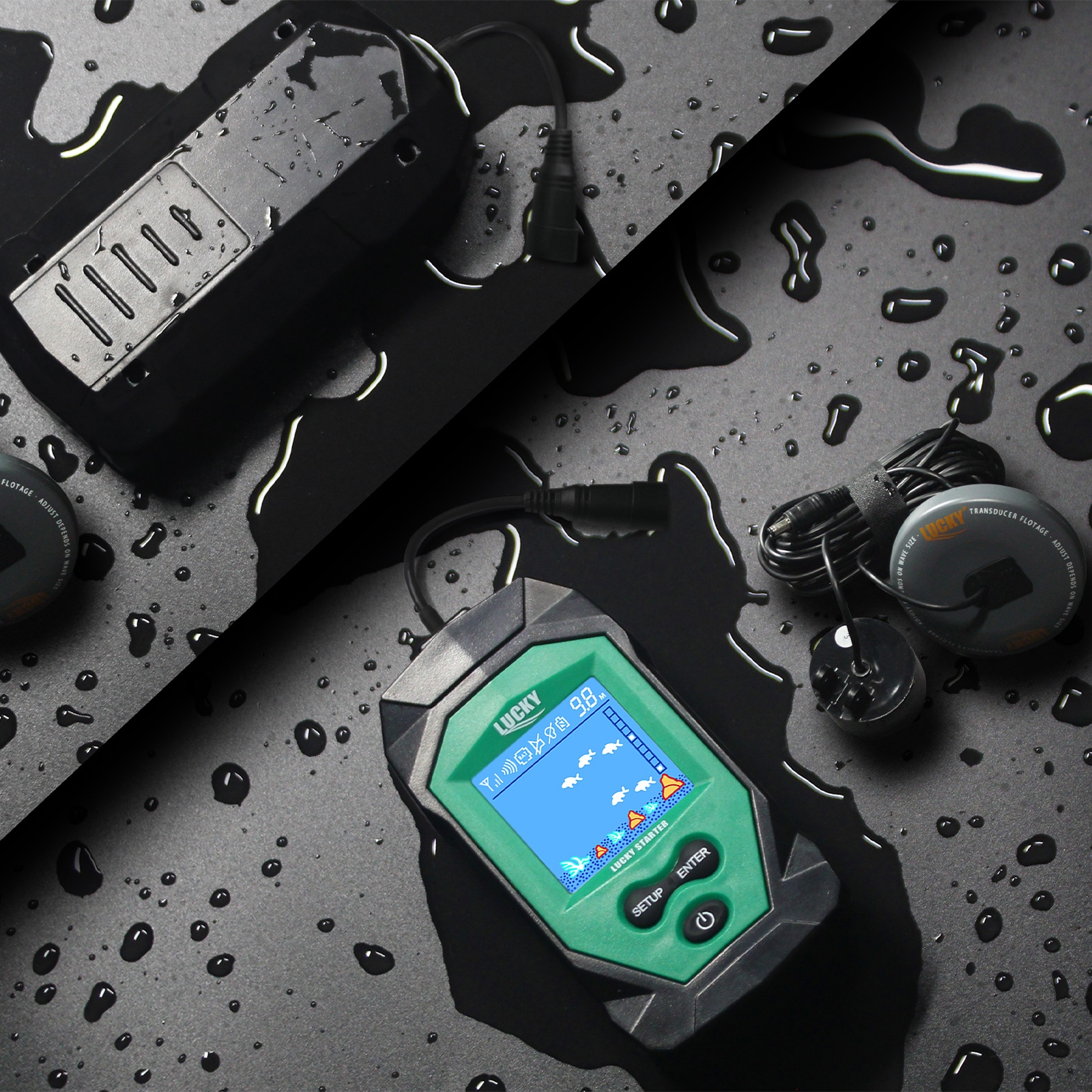 3. wszystko gotowe. sonar zaczyna działać po kontakcie z wodą i od razu na wyświetlaczu pojawiają się wszystkie dane.
