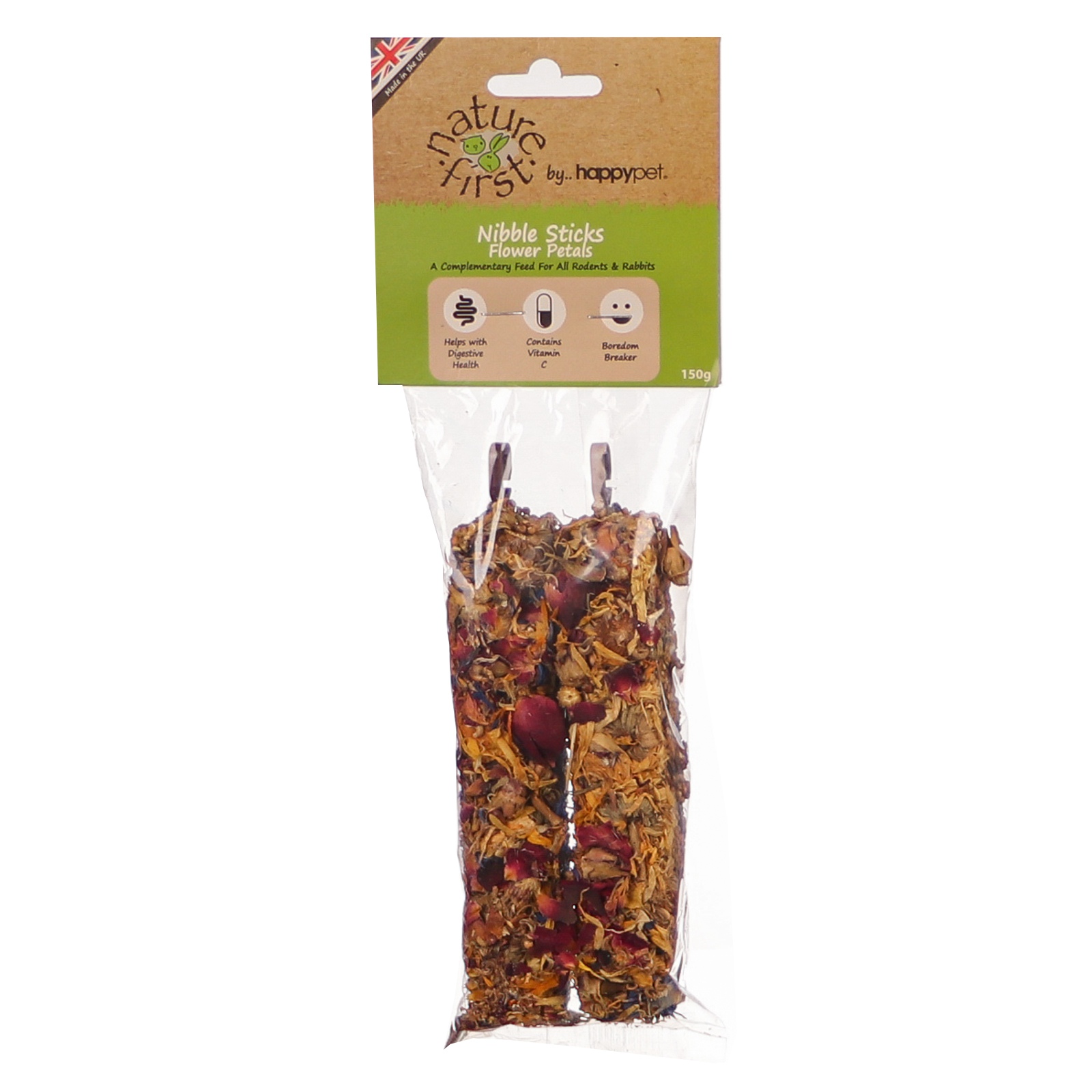 Nature First Nibble Sticks Flower Petals to przepyszna karma uzupełniająca dla wszystkich gryzoni i królików w postaci dwóch patyczków do skubania. Przekąska wspomaga działanie układu pokarmowego, zawiera witaminę C i jest genialnym przerywaczem nudy dla Twojego gryzonia. To naprawdę niezła rozrywka! Specjalnie wyselekcjonowane patyczki Nature First stanowią zabawny przysmak, który zachęca do poszukiwania pożywienia i urozmaica dietę wszystkich gryzoni i królików.