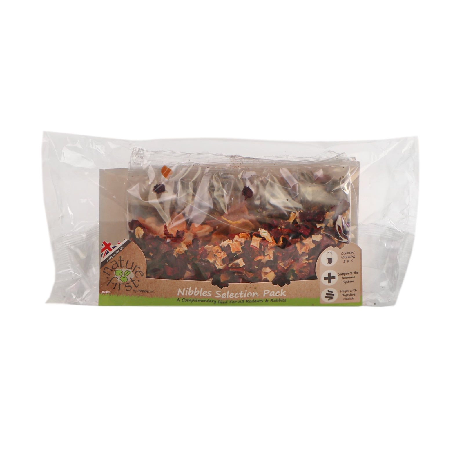 Nature First Nibbles Selection Pack to zestaw przekąsek stanowiących uzupełnienie karmy dla wszystkich gryzoni i królików. Pokarm zawiera witaminy z grupy B oraz C, wspomaga układ odpornościowy i działanie układu pokarmowego. Specjalnie wyselekcjonowane Nibbles Nature First to mieszanka suszonych warzyw i kwiatów, która urozmaica dietę wszystkich gryzoni i królików. Suszone warzywa dostarczają dużo błonnika i utrzymują zdrowie jamy ustnej.