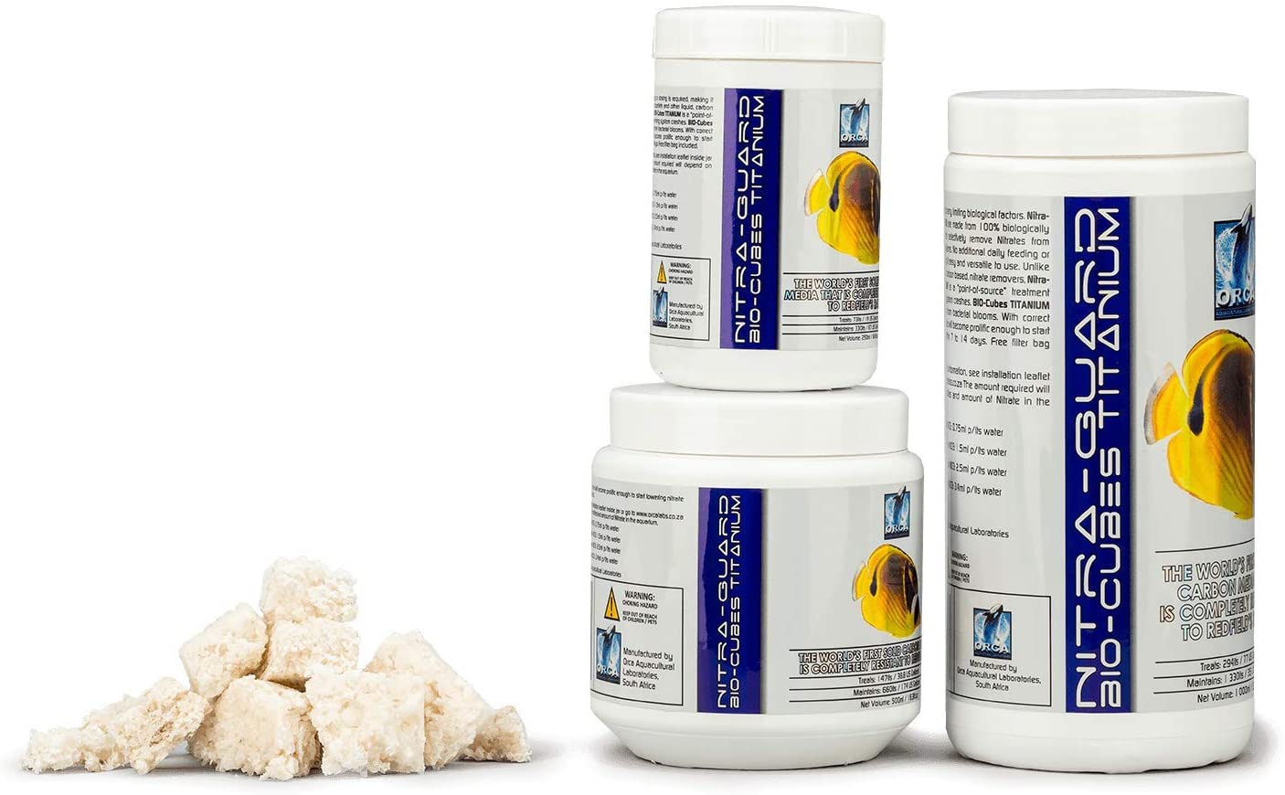 Zalecane jest użycie 1ml/1l zbiornika w przypadku akwarium z małą obsadą życia i 3ml/1l w akwarium z dużą obsadą. Orca LAB Nitra-Guard Bio-Cubes TITANIUM najlepiej umieścić blisko odpieniacza białek w celu szybszego usuwaniu biomasy bogatej w azotany. W przypadku gdy poziomy NO3 i PO4 w akwarium są na wysokim poziomie może wystapić okresowe zmętnienie wody. Bio-Cubes Titanium należy przed użyciem moczyć przez 24h w słodkiej wodzie.