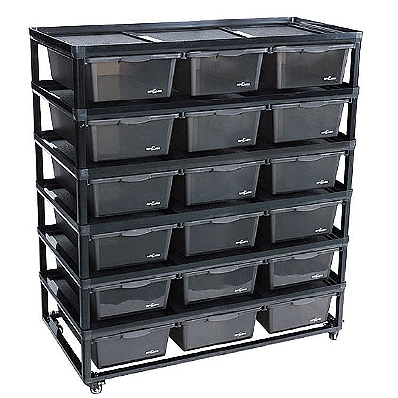 Podstawki posiadają poręczne wysuwane szuflady. Konstrukcja szuflad oraz ich perforowanej pokrywy umożliwiają hodowanie wewnątrz nich karmówki lub wykorzystywanie ich jako inkubator. Stelaże IN00 mają możliwość dołożenia metalowych paneli grzewczych IN002H/003H/004H, aby stworzyć bezpieczne inkubatory.