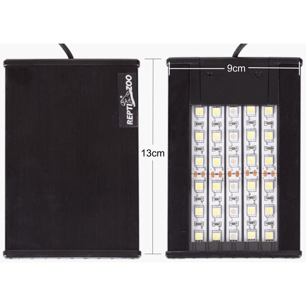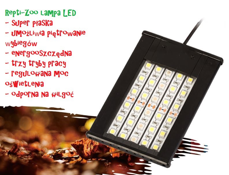 Lampa LED Repti-Zoo to najnowocześniejsze podejście do oświetlenia terrarium tropikalnego. Posiada szereg udogodnień i pomysłowych rozwiązań, które czynią ją niezastąpioną oraz dużo lepszą od zwykłego oświetlenia żarowego. Lampa jest energooszczędna (6W) oraz przystosowana do pracy w trudnych warunkach, a jej gabaryty umożliwiają włożenie jej pomiędzy terraria pozwalając na ich piętrowanie.