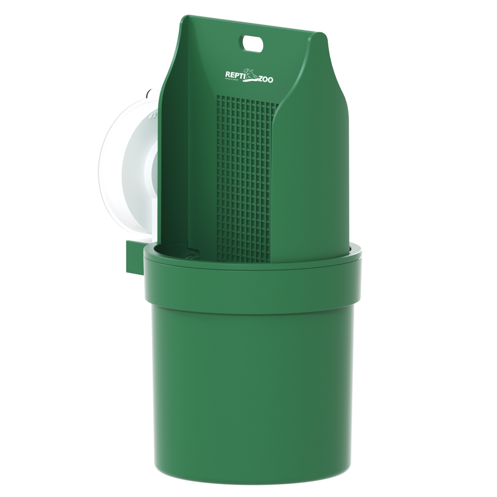 Karmnik można umieść na bocznej ścianie terrarium za pomocą dołączonej do zestawu przyssawki. Miska jest prosta w montażu i demontażu.