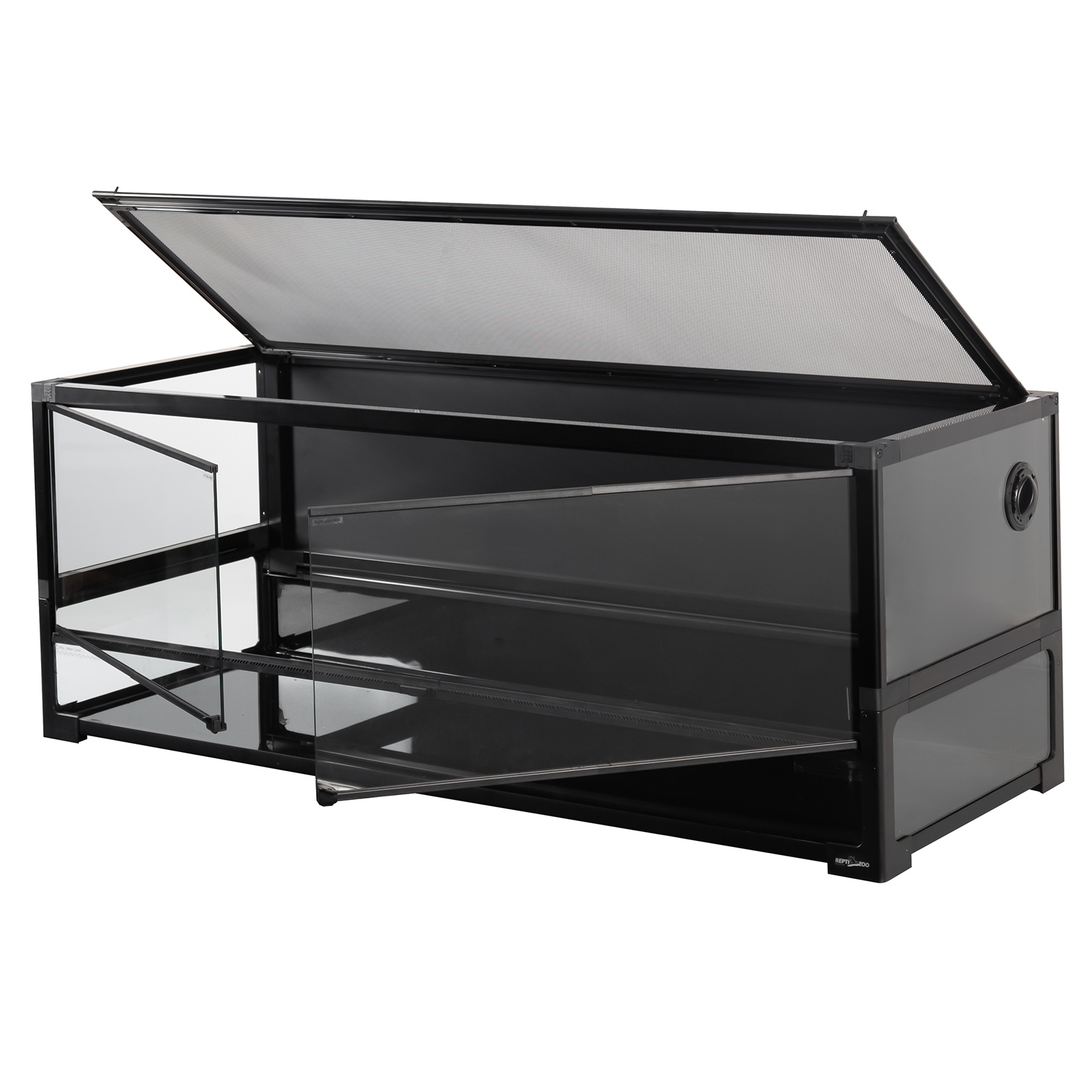 Przednia pokrywa terrarium posiada wbudowaną listwę wentylacyjną, która wspomaga przepływ powietrza i minimalizuje gromadzenie się wilgoci.