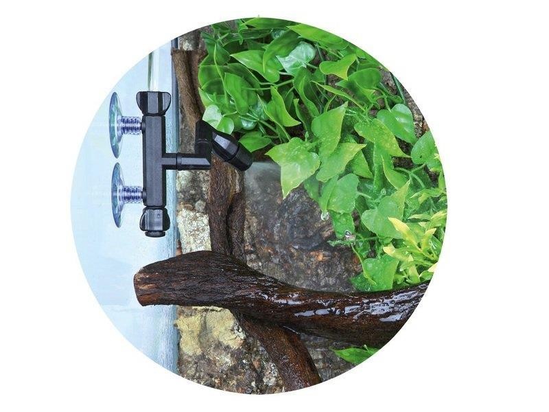 System zraszający TerraRain służy do podniesienia wilgotności w całym terrarium, oraz do automatycznego zraszania i nawadniania roślin w terrarium i akwaterrarium. Nawilżacz posiada regulowaną pompę ciśnieniową z filtrem do pobierania wody ze zbiornika lub bezpośrednio z terrarium. Wyposażony w elementy mocujące dla bezpiecznego przyczepiania głowic spryskujących. Dzięki systemowi możemy uzyskać wysoką wilgotność w terrarium oraz podlewać rośliny.