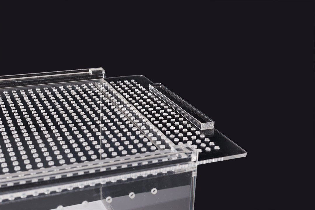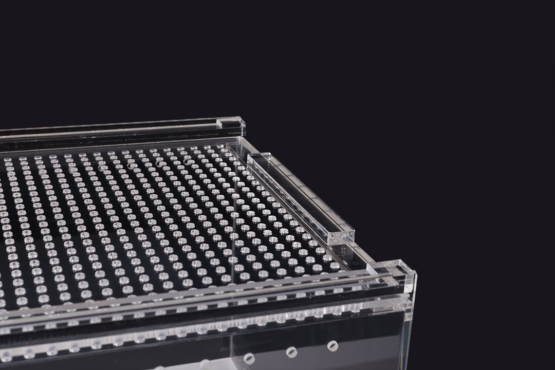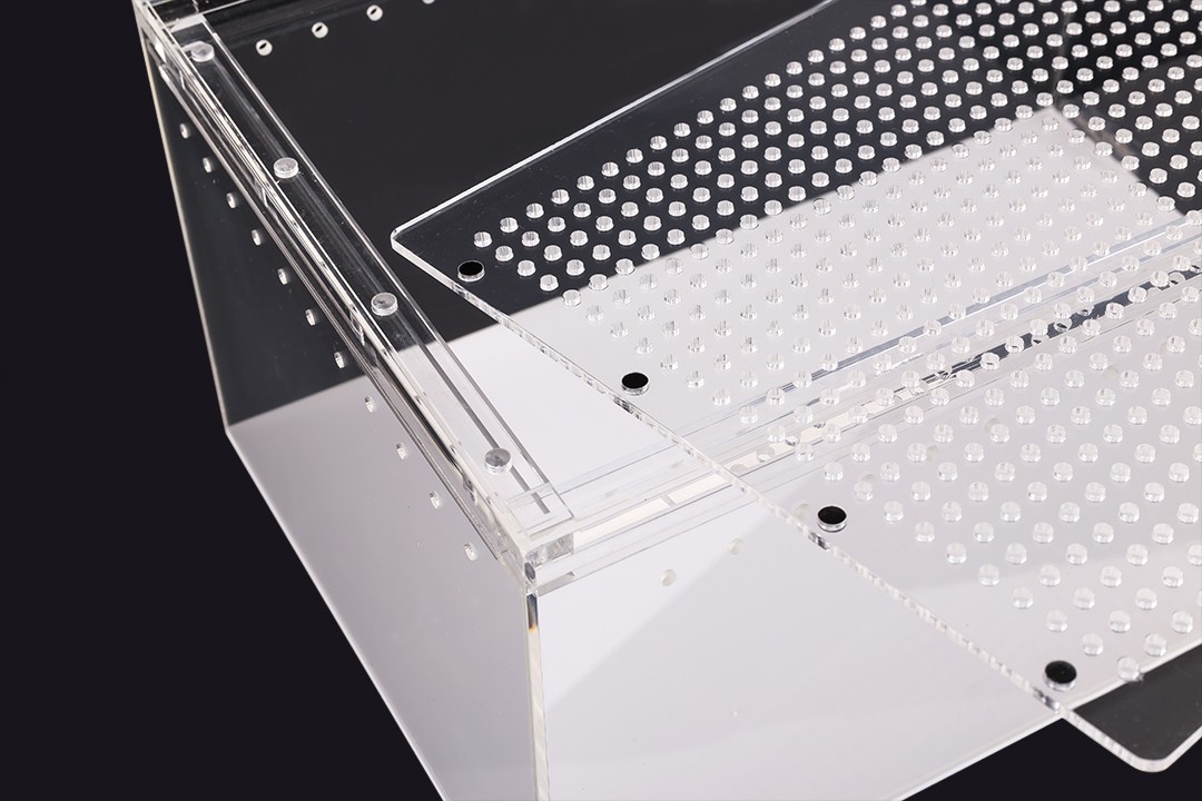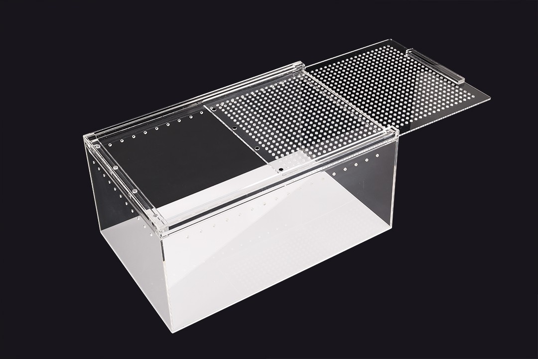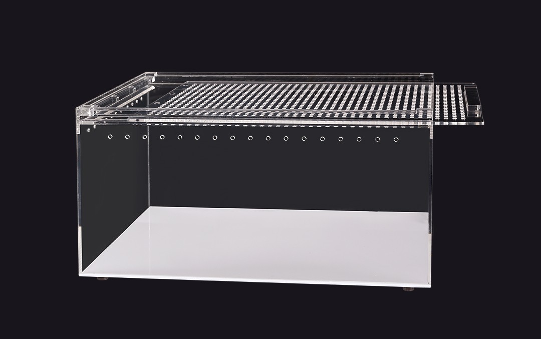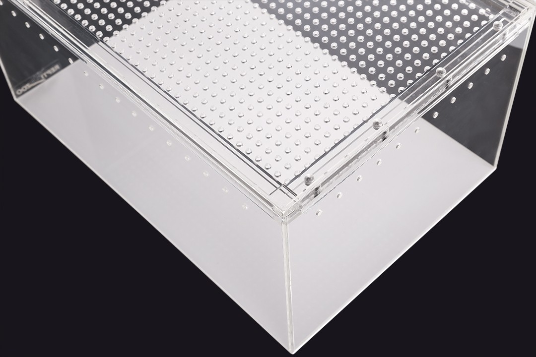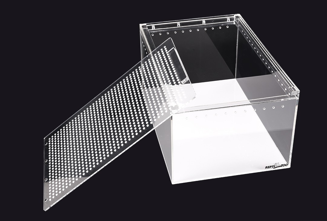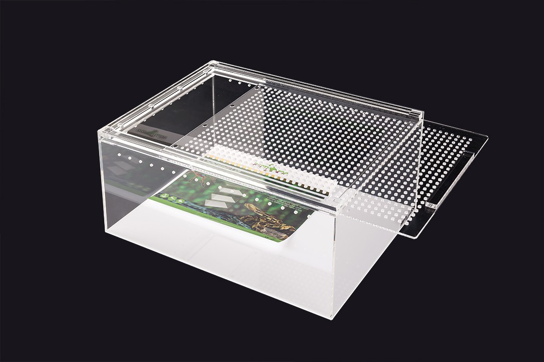 Terrarium wykonane z akrylu kryształowego cechuję się dużą lekkością i wygodną konstrukcją oraz doskonałą przejrzystością bez efektu załamywania się światła. Gładkie odporne na ścieranie ściany ułatwiają czyszczenie i zapobiegają osiadaniu się drobnoustrojów.