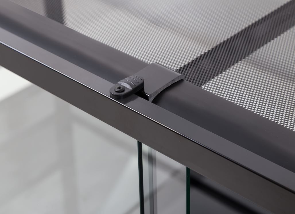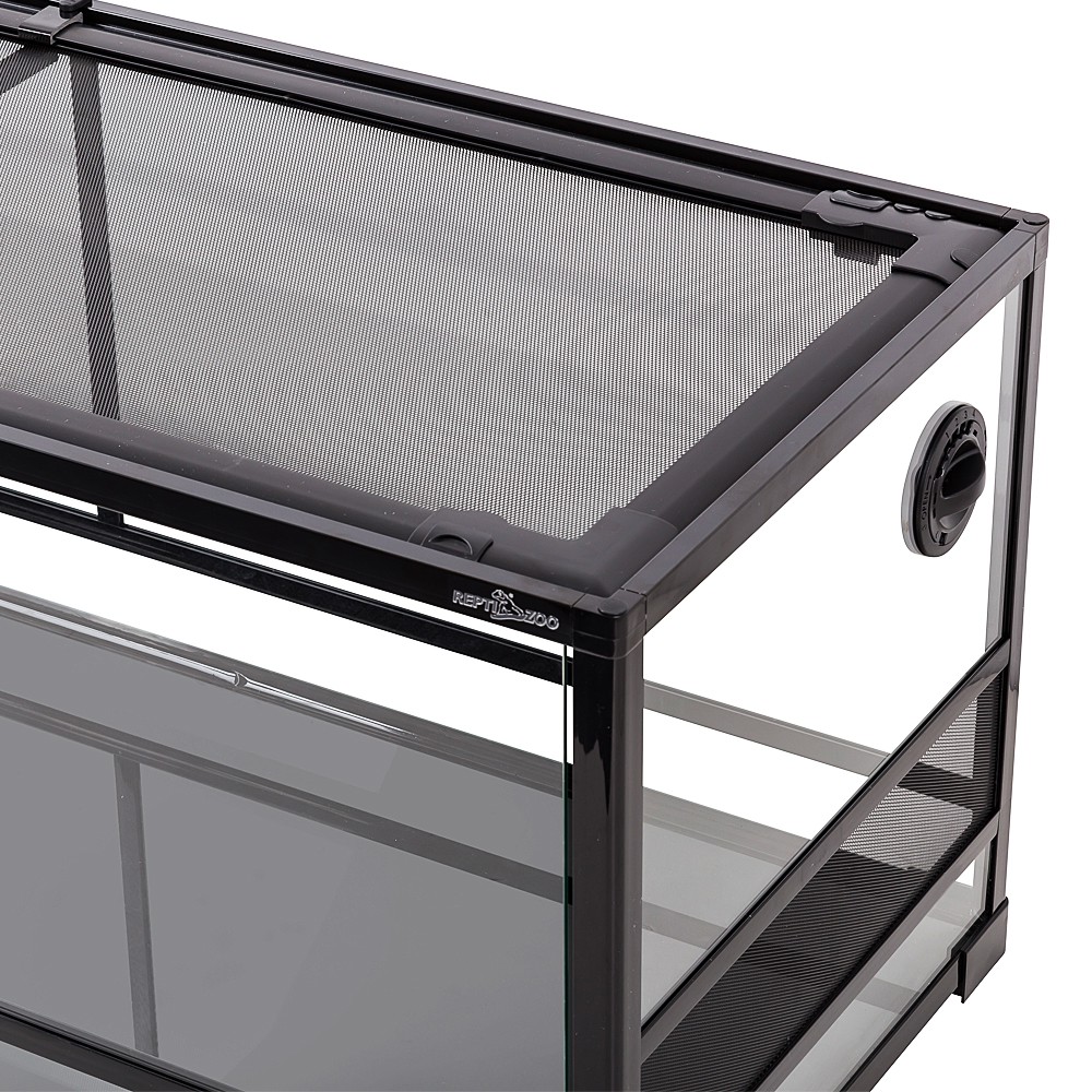 Górną pokrywę terrarium stanowi odporna na wysokie temperatury i rdzewienie stalowa siatka. Siatka ta jest w całości wyjmowana, co ułatwia dostęp do wnętrza terrarium bez ryzykowania ucieczki zwierzęcia oraz stresowania zwierzęcia. Jednocześnie jest ona zabezpieczona specjalnymi zamkami uniemożliwiając, nawet najsilniejszemu pupilowi, ucieczkę. Siatka zapewnia doskonałą wymianę gazową dodatkowo zabezpiecza pupila przed poparzeniem się w przypadku kontaktu z lampą grzewczą.