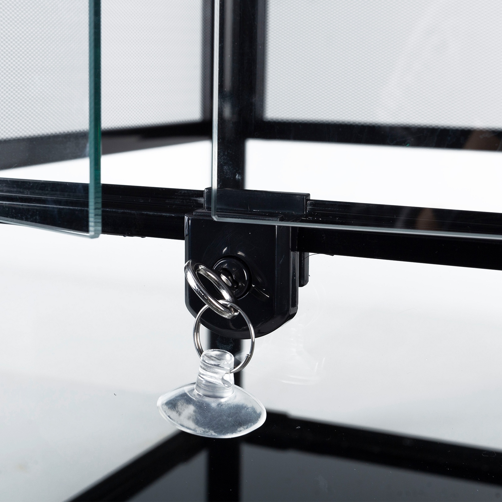 Każde Terrarium z serii RK posiada zamek z kluczykiem zamontowany na drzwiach przesuwanych. Jest to standardowe zabezpieczenie przed przypadkowym otwarciem drzwi przez pupila. Jednocześnie uniemożliwia niepożądanym osobom dostęp do wnętrza wybiegu od zewnątrz. Jest to niezwykle ważne podczas hodowli zwierząt jadowitych czy agresywnych w domu w którym znajdują się dzieci. W zestawie znajduje się dodatkowy kluczyk.