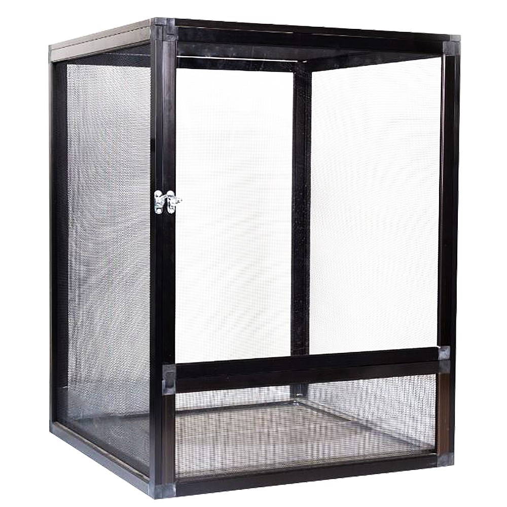 Terrarium w całości wykonane jest z siatki aluminiowej, za wyjątkiem drzwiczek, które wykonane są z przeźroczystego akrylu oraz podstawy.