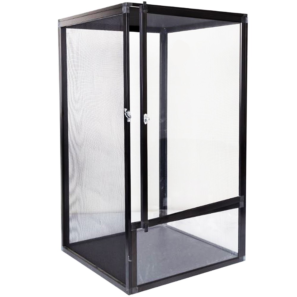 Terrarium w całości wykonane jest z siatki aluminiowej, za wyjątkiem drzwiczek, które wykonane są z przeźroczystego akrylu oraz podstawy.