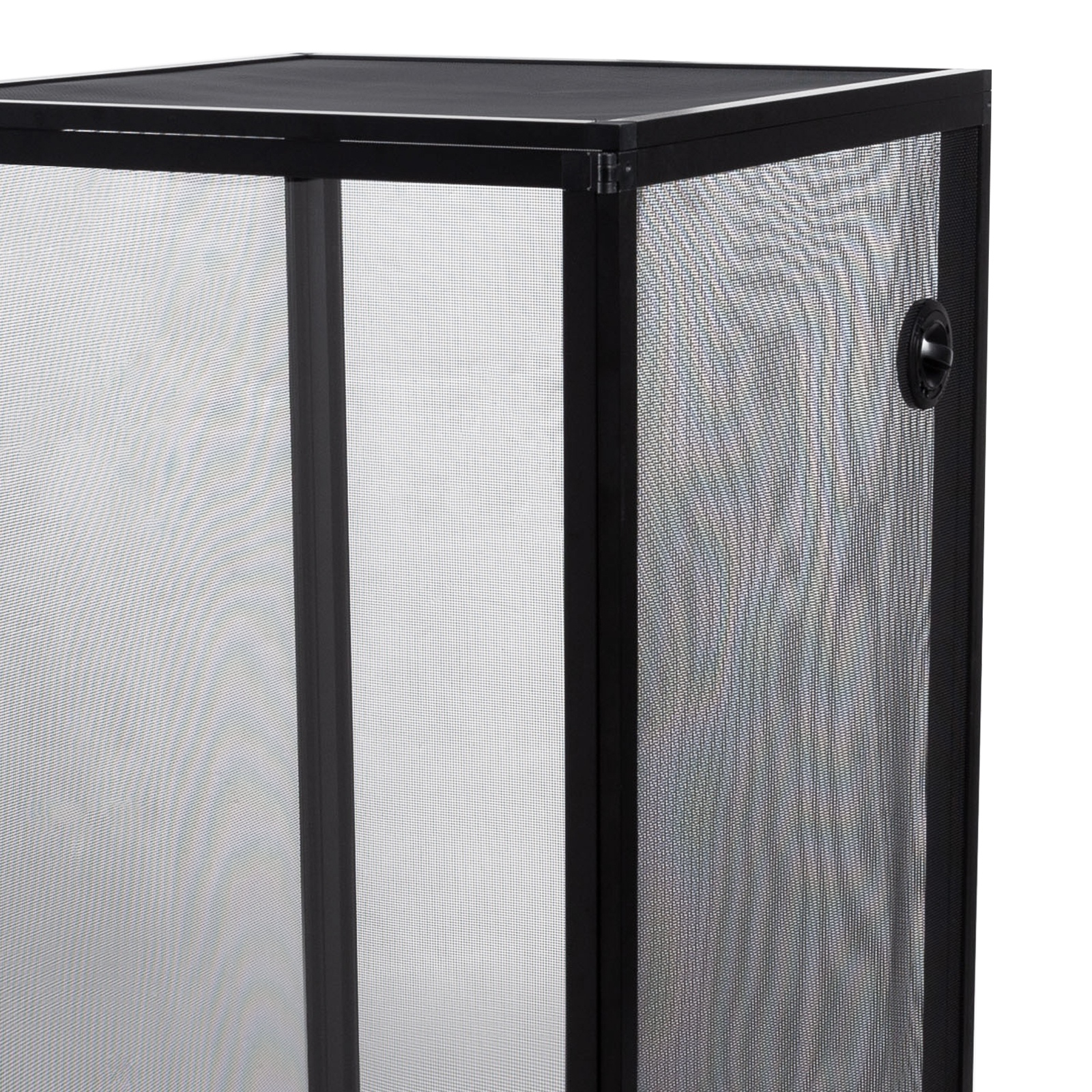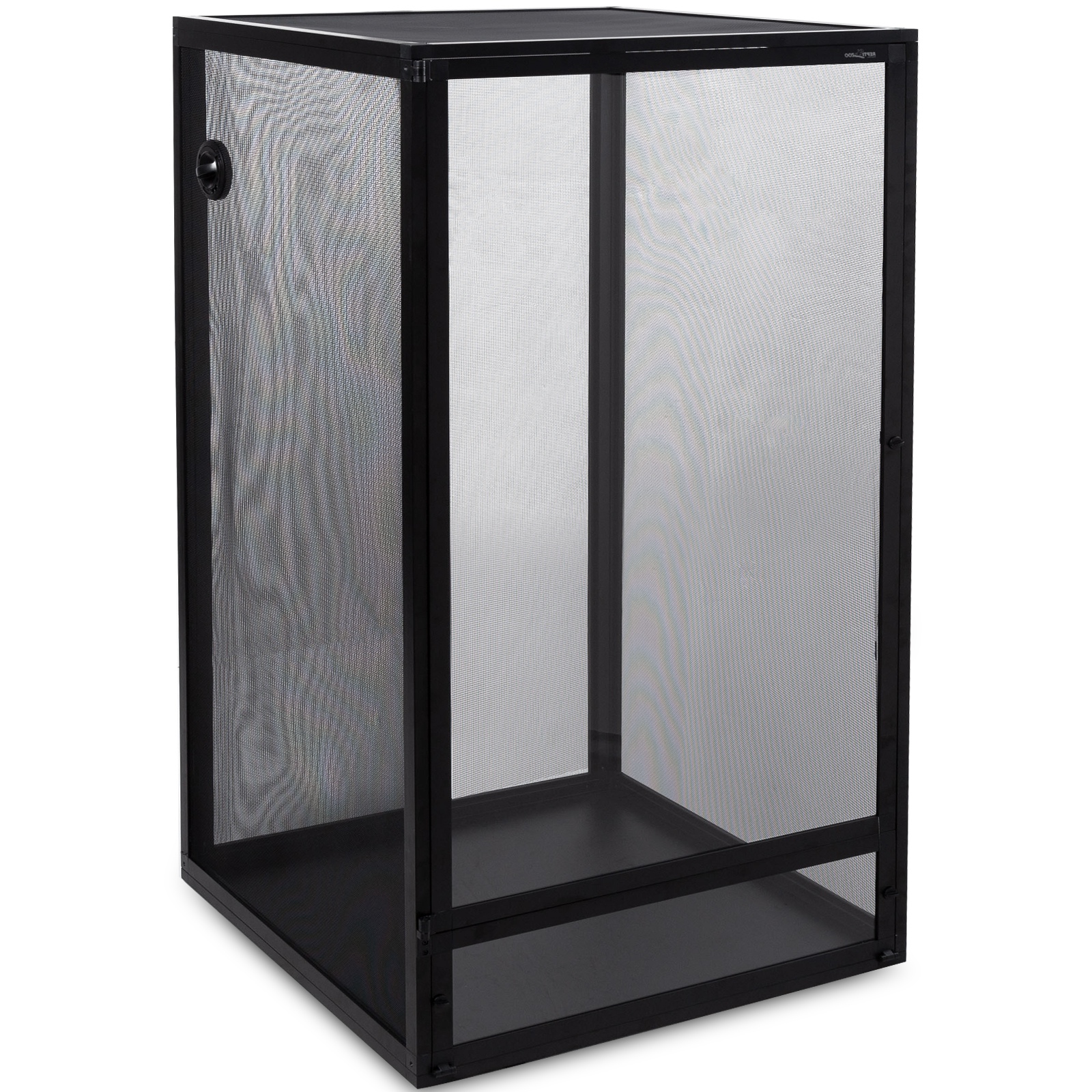 Terrarium w całości wykonane jest z siatki aluminiowej, za wyjątkiem drzwiczek, które wykonane są z przeźroczystego akrylu oraz podstawy.